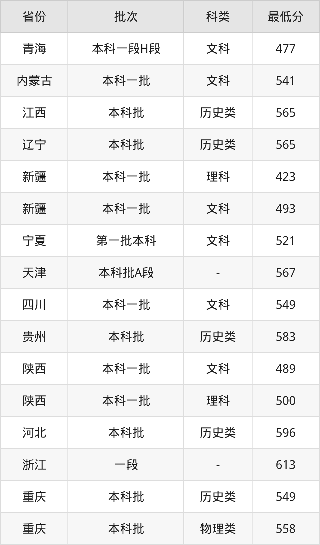 | 批次 | 科类 | 最低分 | 位次 |