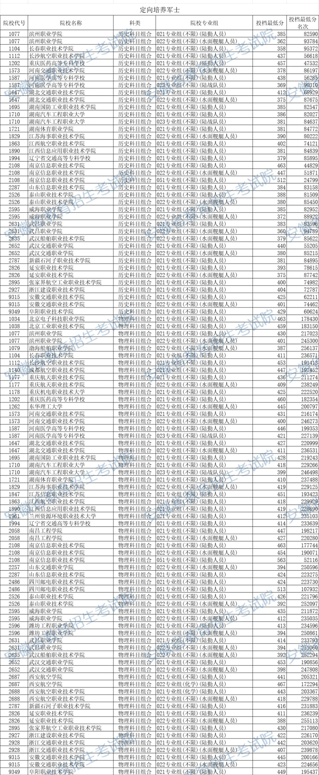 以下是部分士官院校在安徽物理类和历史类的最低分: