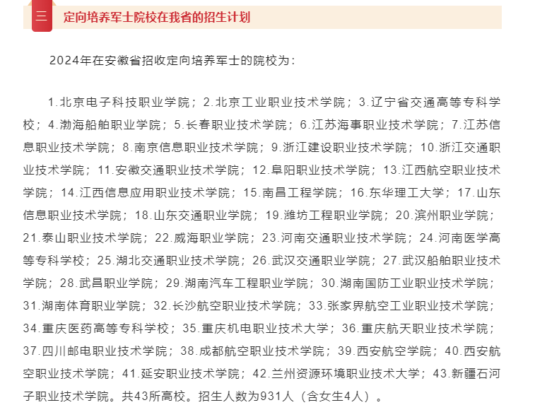 2024年在安徽招生的士官院校有43所,共在安徽招收定向军士931人(含女生4人),招生院校有北京电子科技职业学院、南京信息职业技术学院、浙江建设职业技术学院、安徽交通职业技术学院、江西信息应用职业技术学院、山东交通职业学院、潍坊工程职业学院、湖北交通职业技术学院、湖南汽车工程职业学院。以下是完整版的院校名单: