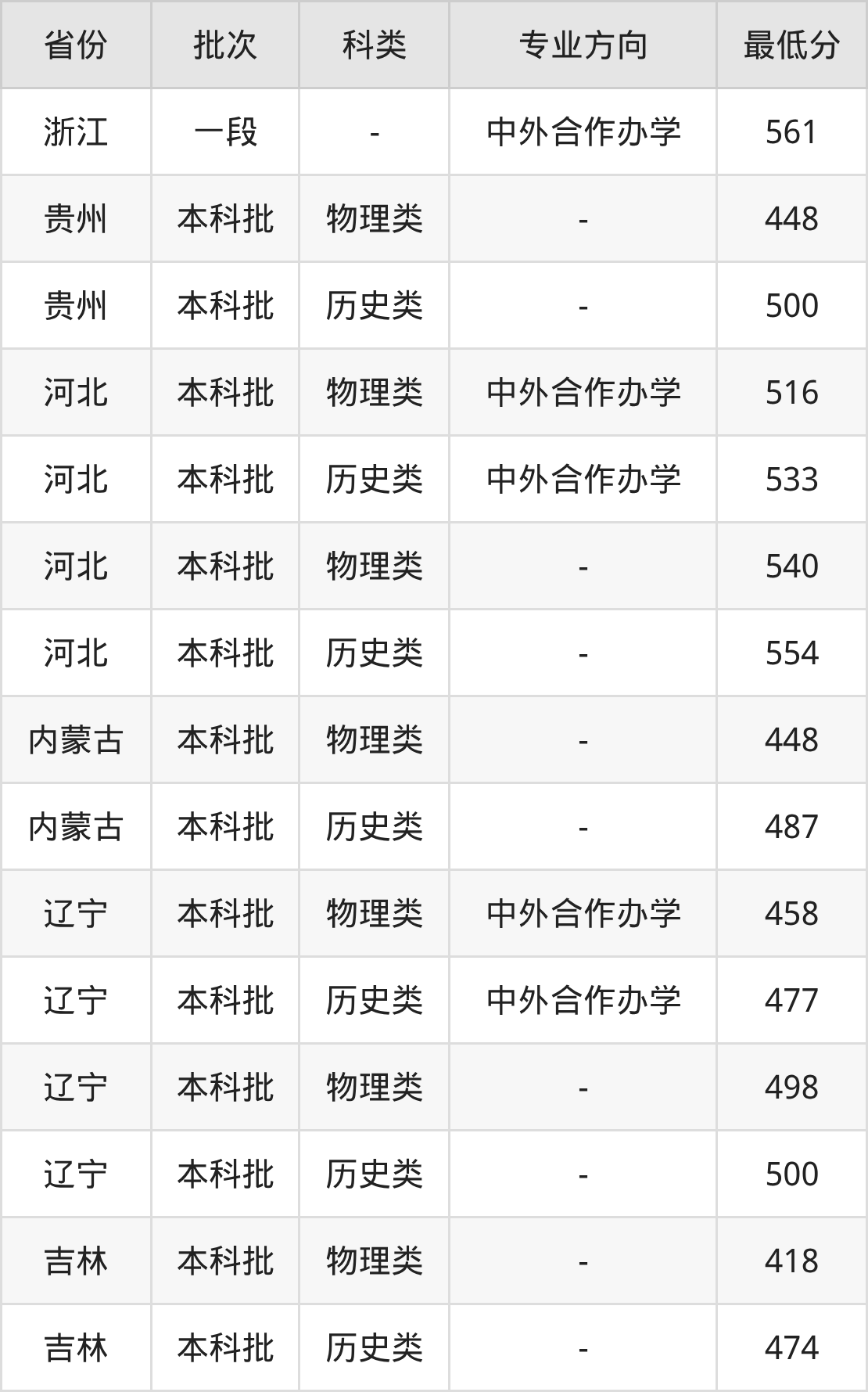 物理类516分(中外合作办学、位次133592名),历史类533分(中外合作办学、位次30800名),物理类540分(位次95459名),历史类554分(位次20836名);