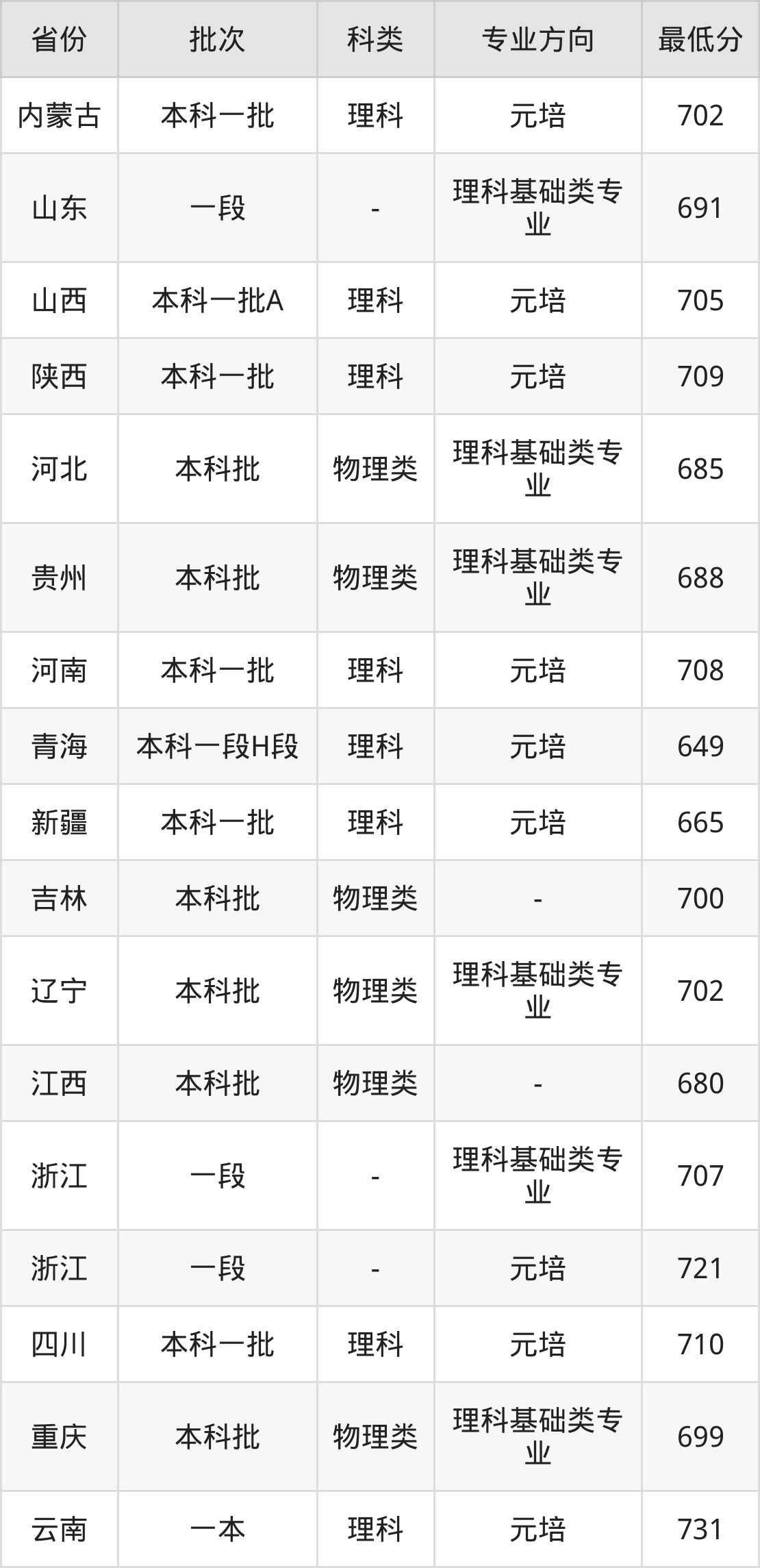 北京大学理科试验班类专业录取分数线2024各省汇总显示,市外招生最低分为辽宁702分、江西680分、浙江707分、山东691分等。更多专业分数详情、选科要求、专业简介等均可在正文查阅。