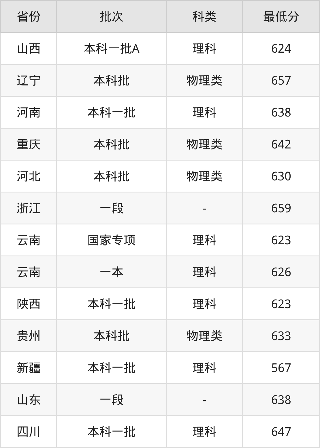 四川大学物理学类专业录取分数线2024各省汇总显示,省内招生最低分为647分,省外招生最低分为山西624分、辽宁657分、河南638分、重庆642分等。更多专业分数详情、选科要求、专业简介等均可在正文查阅。