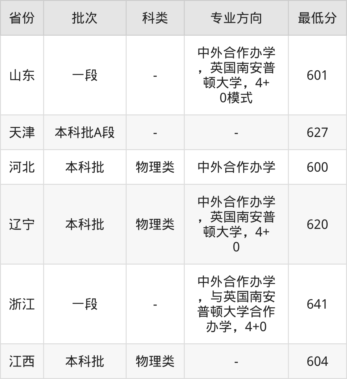 物理类620分(中外合作办学,英国南安普顿大学,4+0、位次9383名);