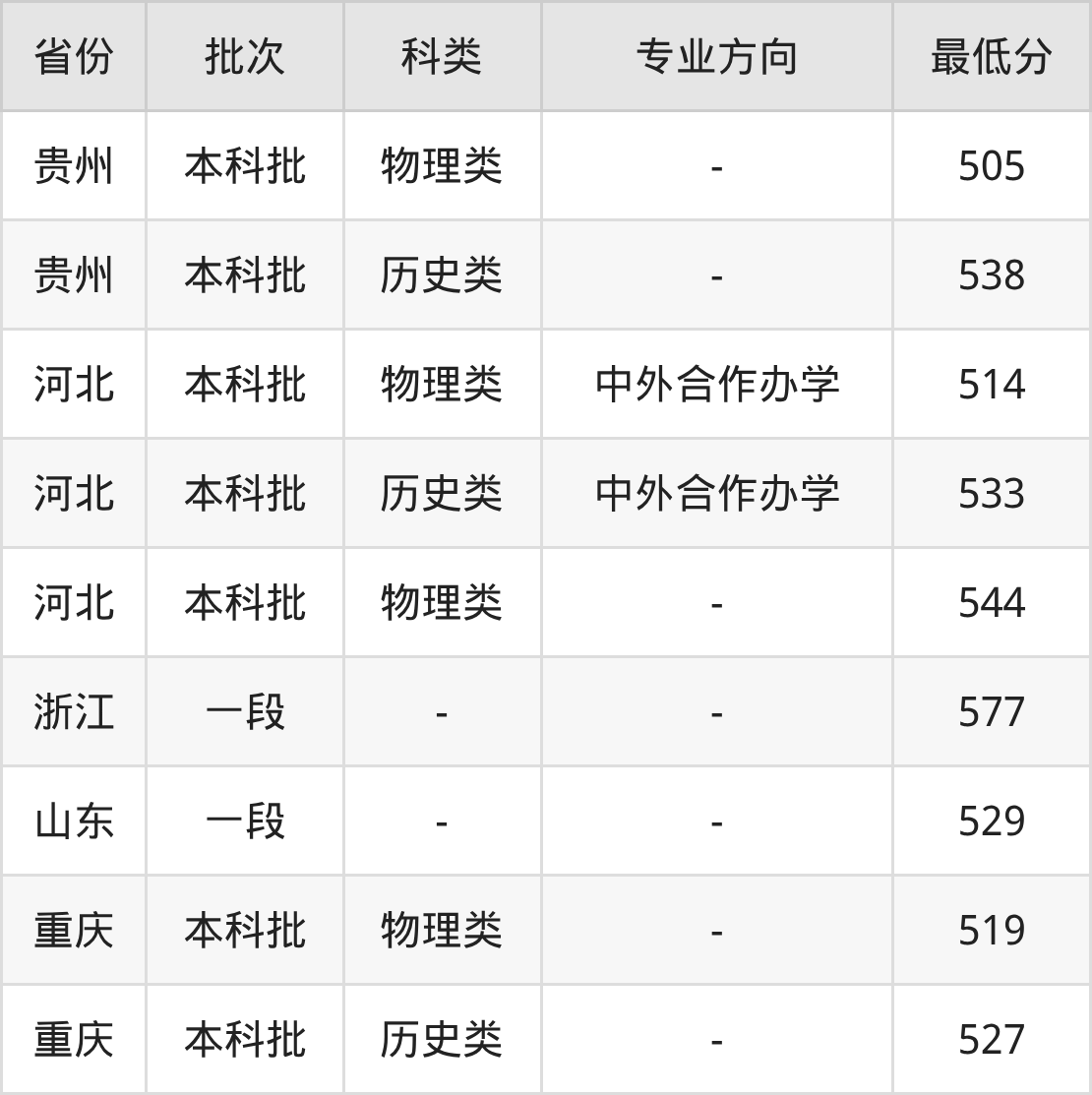 物理类514分(中外合作办学、位次136965名),历史类533分(中外合作办学、位次30800名),物理类544分(位次89552名);