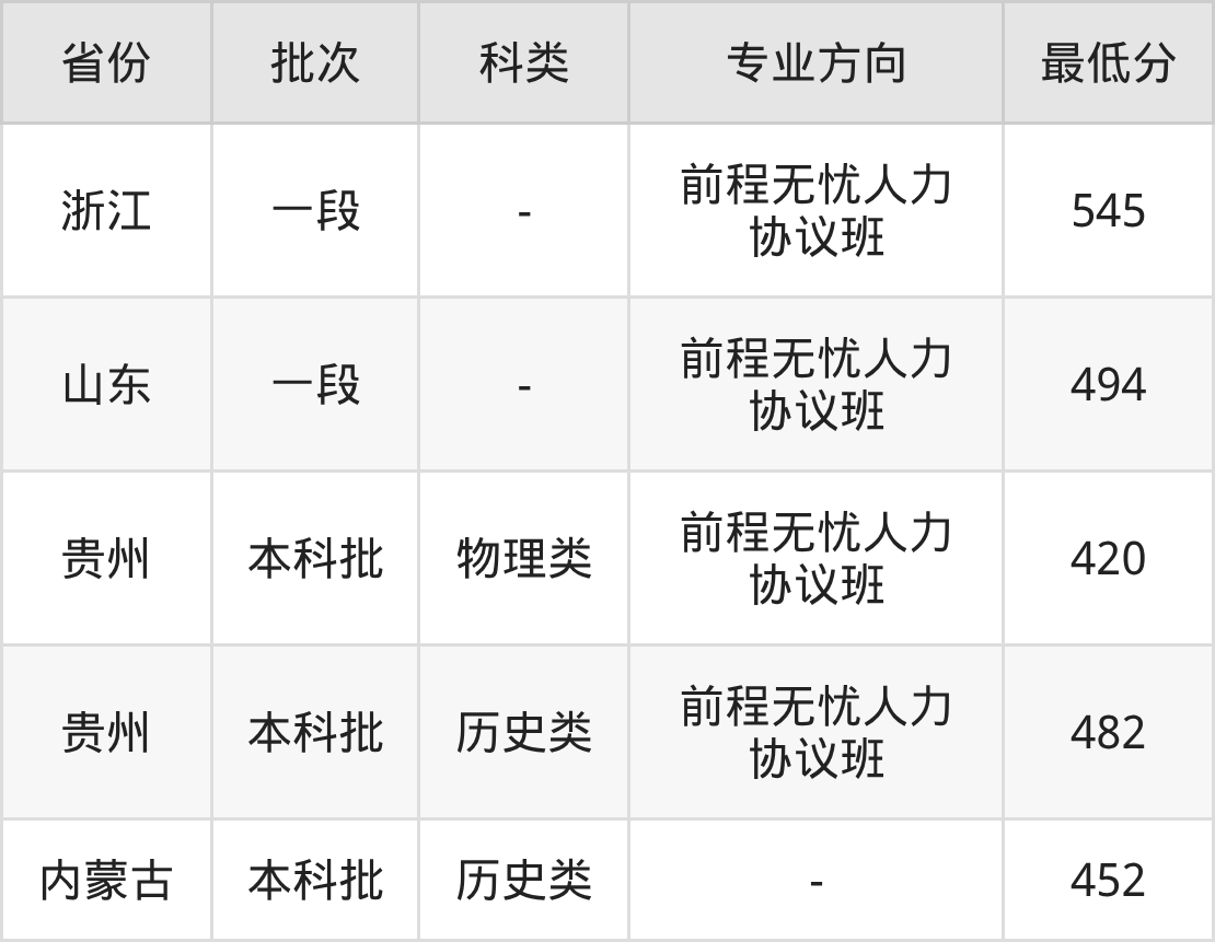 武汉工商学院人力资源管理专业录取分数线2025各省汇总显示,省外招生最低分为内蒙古452分、浙江545分、山东494分、贵州420分。更多专业分数详情、选科要求、专业简介等均可在正文查阅。