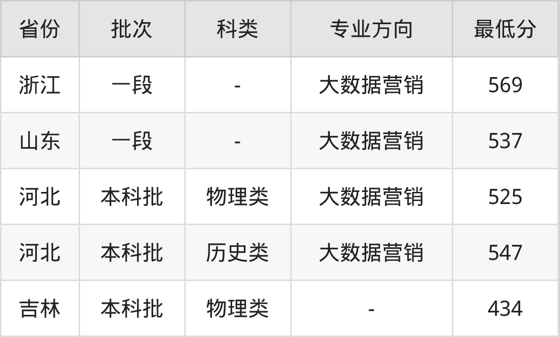 湖南财政经济学院市场营销专业录取分数线2025各省汇总显示,省外招生最低分为河北525分、吉林434分、浙江569分、山东537分。更多专业分数详情、选科要求、专业简介等均可在正文查阅。