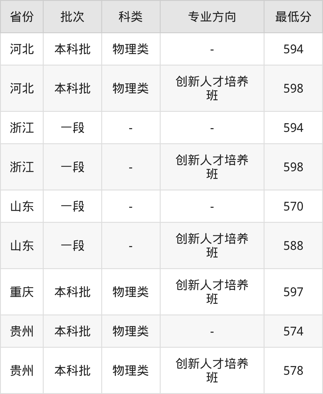 594分(位次58790名),598分(创新人才培养班、位次54301名);