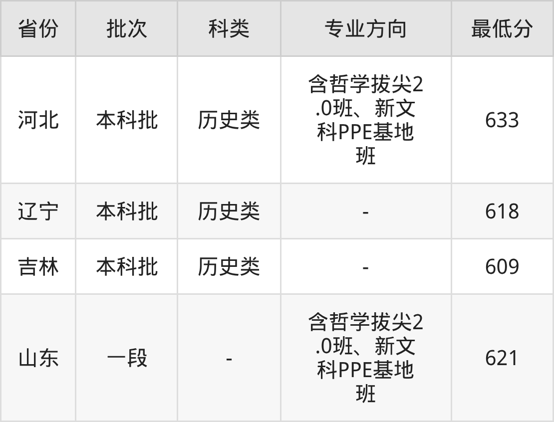 历史类633分(含哲学拔尖2.0班、新文科PPE基地班、位次1262名);