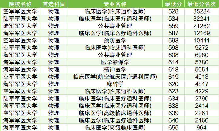 以物理类为例,考生可报考的最低分军医大学有空军军医大学(临床医学(临床通科医师)),2024年最低分均为528分,位次范围在964-35234名之间。