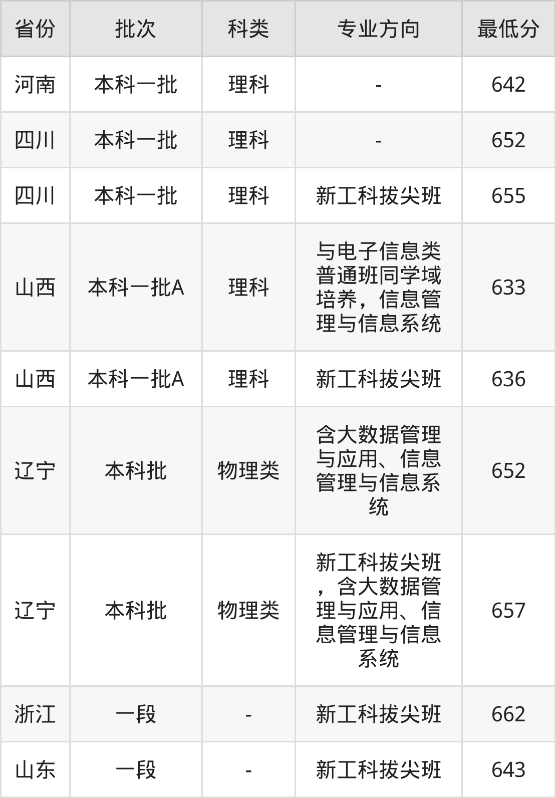 理科633分(与电子信息类普通班同学域培养,信息管理与信息系统、位次2595名),理科636分(新工科拔尖班、位次2297名)。