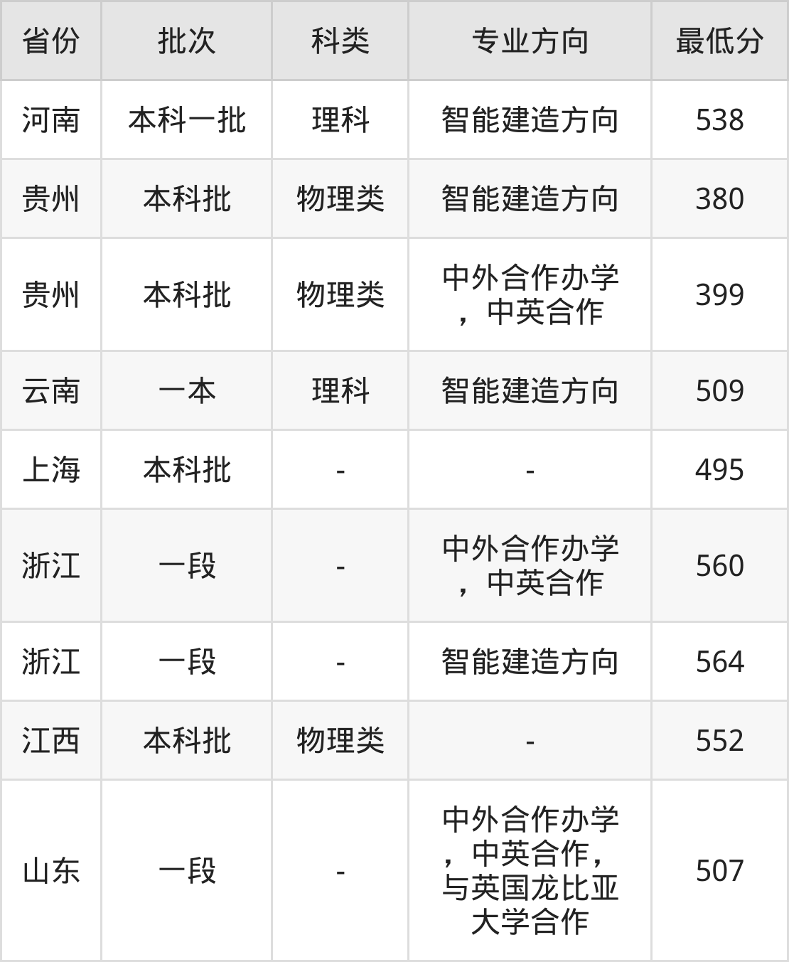 560分(中外合作办学,中英合作、位次99602名),564分(智能建造方向、位次94558名);