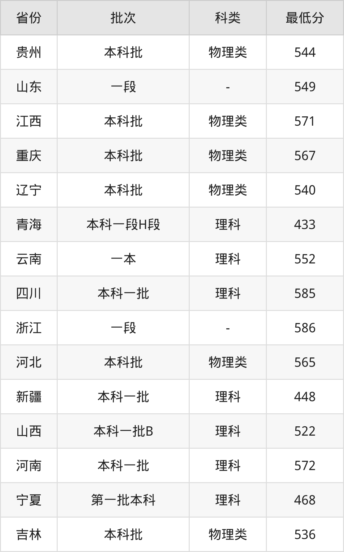 | 批次 | 科类 | 最低分 | 位次 |