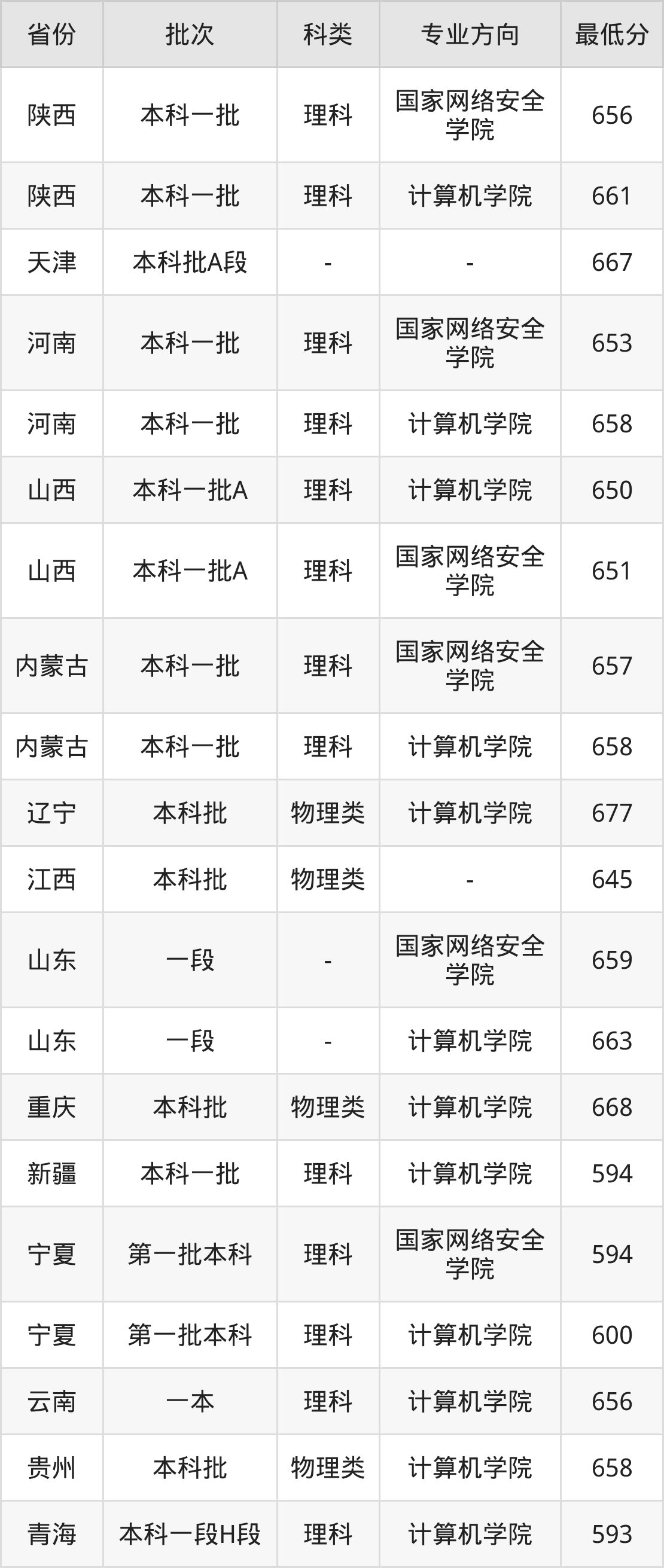 理科656分(国家网络安全学院、位次1501名),理科661分(计算机学院、位次1233名);