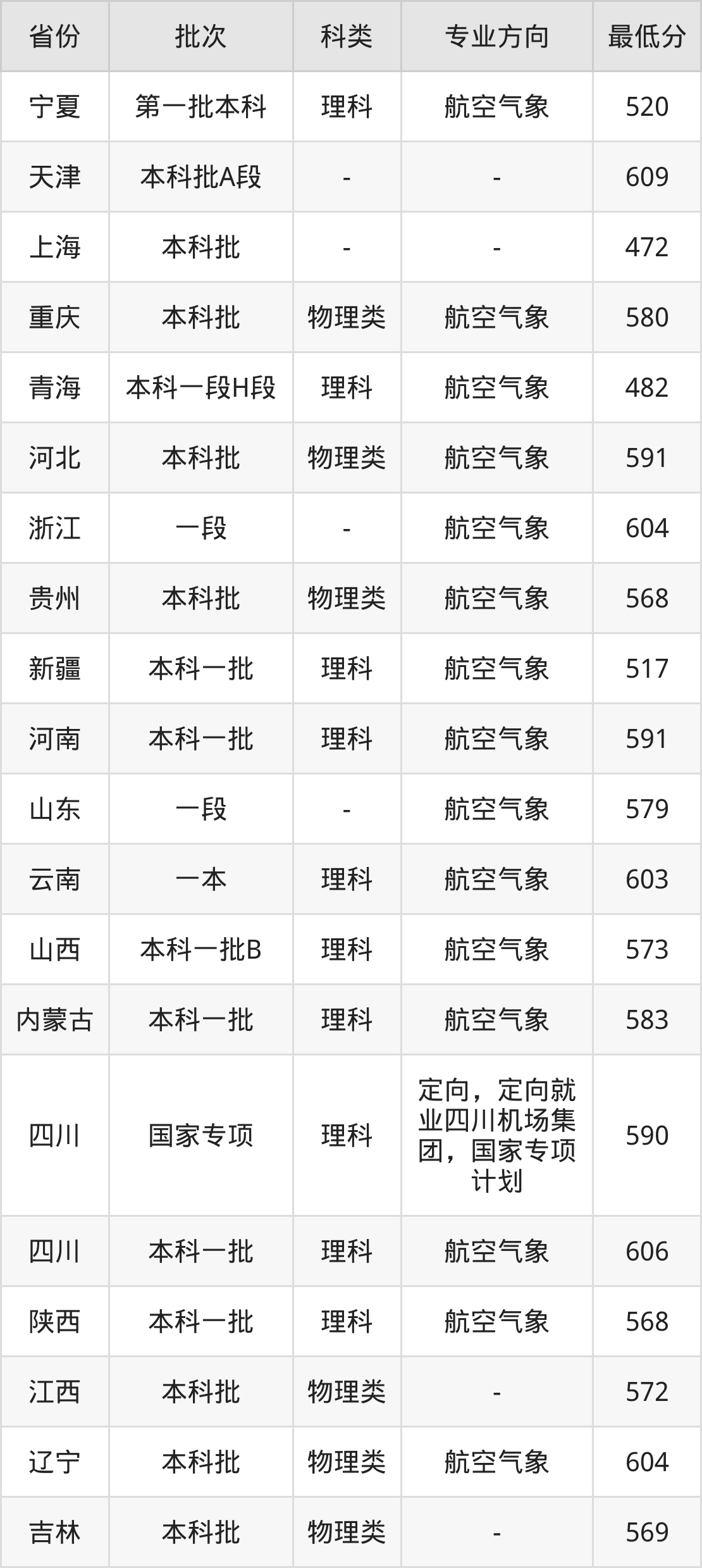 理科590分(定向,定向就业四川机场集团,国家专项计划、位次33245名),理科606分(航空气象、位次22523名);