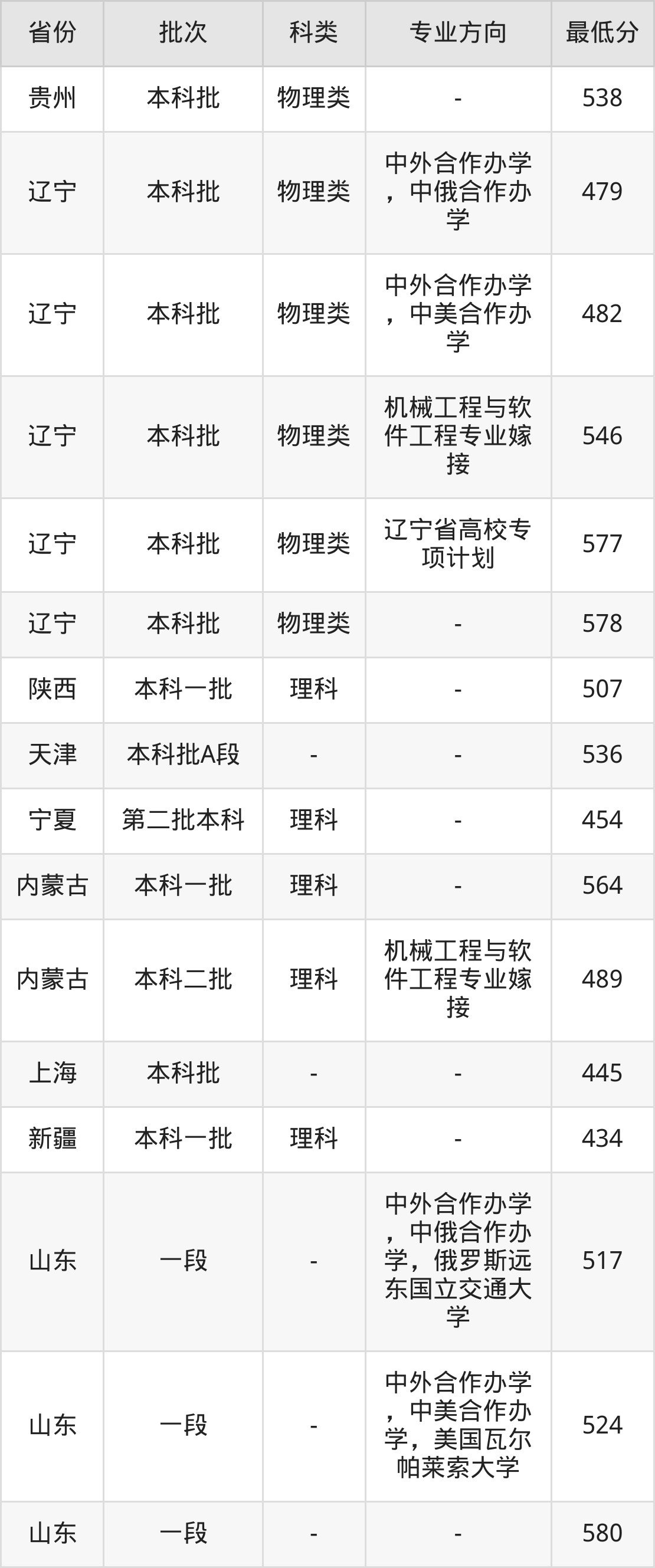 517分(中外合作办学,中俄合作办学,俄罗斯远东国立交通大学、位次139022名),524分(中外合作办学,中美合作办学,美国瓦尔帕莱索大学、位次123844名),580分(位次38467名);