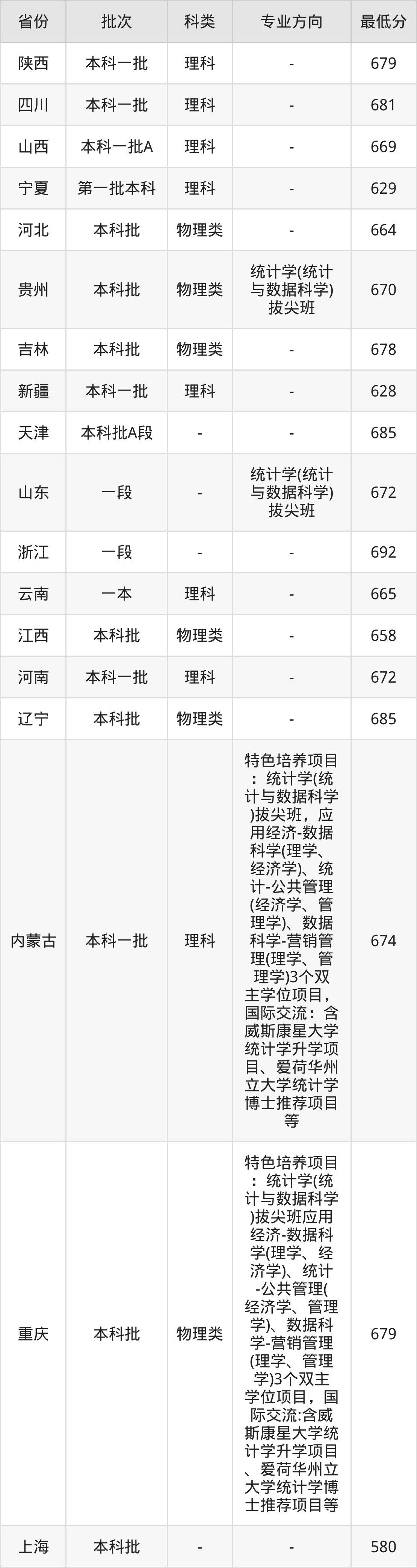 理科674分(特色培养项目:统计学(统计与数据科学)拔尖班,应用经济-数据科学(理学、经济学)、统计-公共管理(经济学、管理学)、数据科学-营销管理(理学、管理学)3个双主学位项目,国际交流:含威斯康星大学统计学升学项目、爱荷华州立大学统计学博士推荐项目等、位次220名);