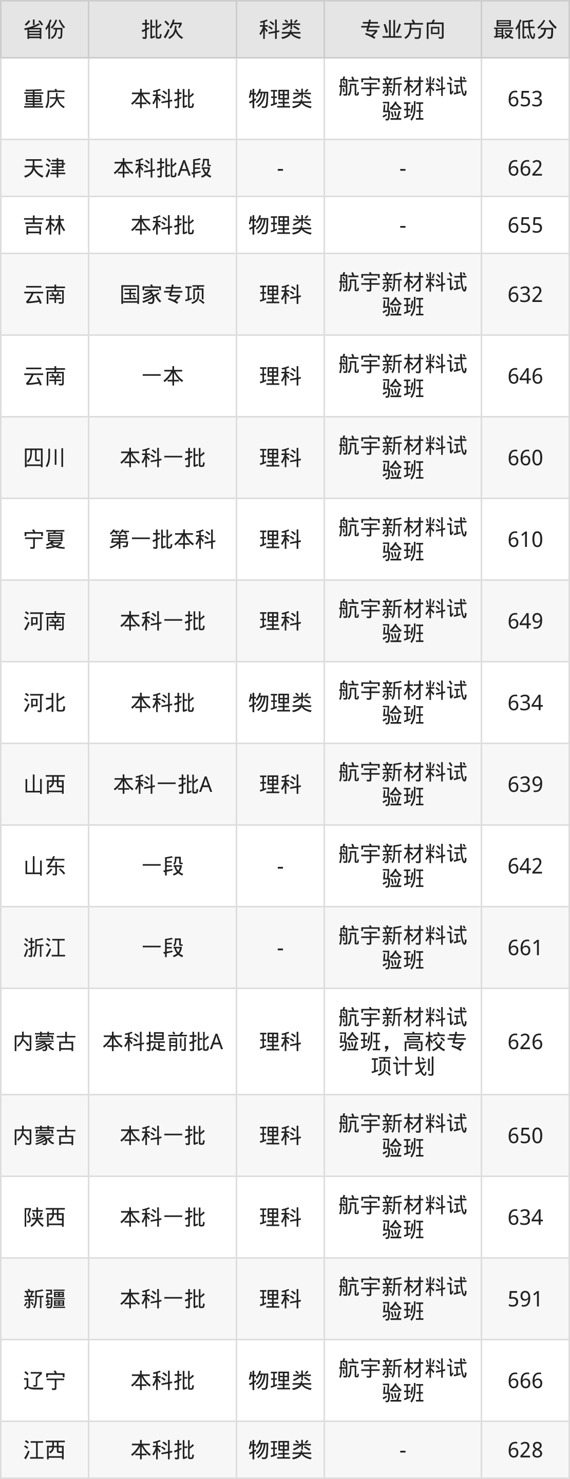 | 本科一批 | 理科 | 航宇新材料试 验班 | 634 | 3589 |