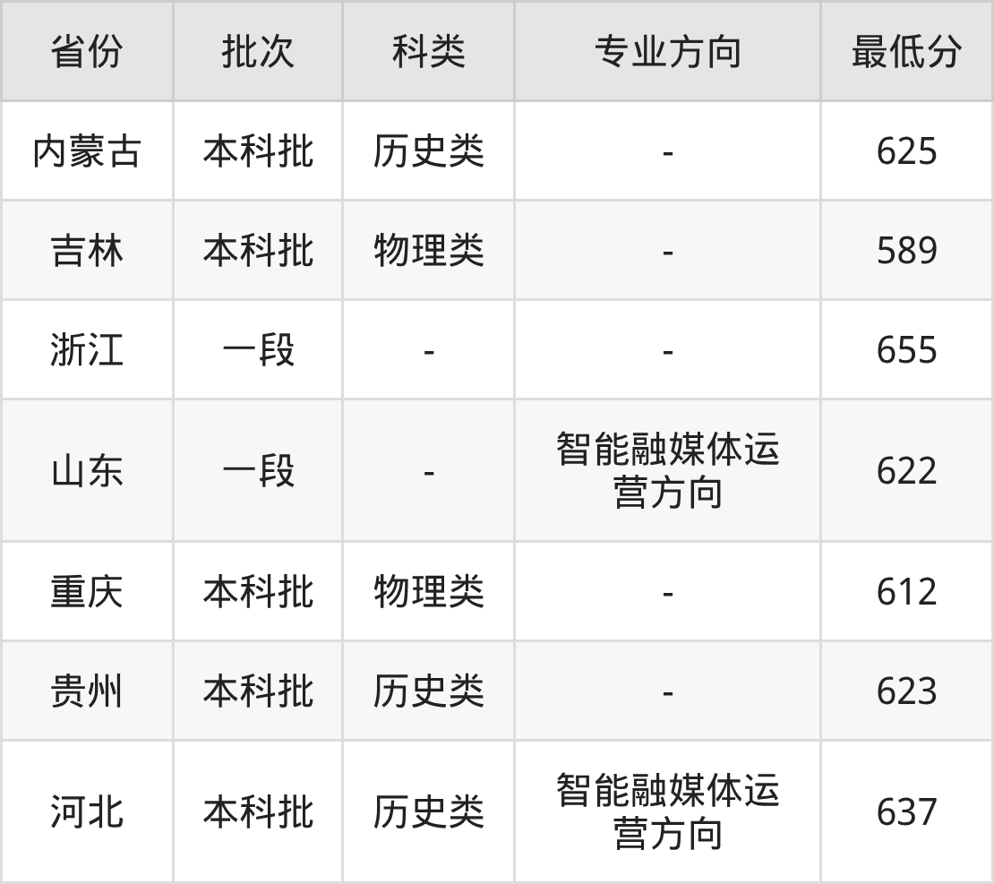 中国传媒大学网络与新媒体专业录取分数线2025各省汇总显示,市外招生最低分为河北637分、内蒙古625分、吉林589分、浙江655分等。更多专业分数详情、选科要求、专业简介等均可在正文查阅。