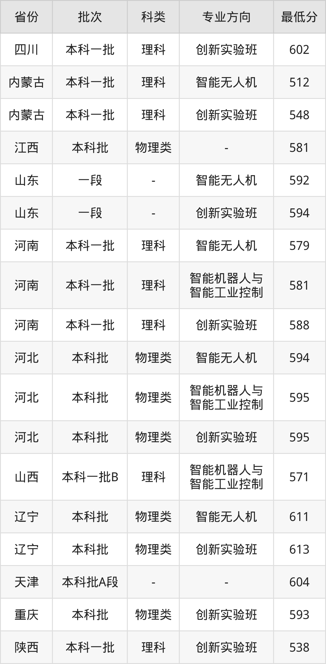 理科579分(智能无人机、位次40541名),理科581分(智能机器人与智能工业控制、位次38682名),理科588分(创新实验班、位次32528名);