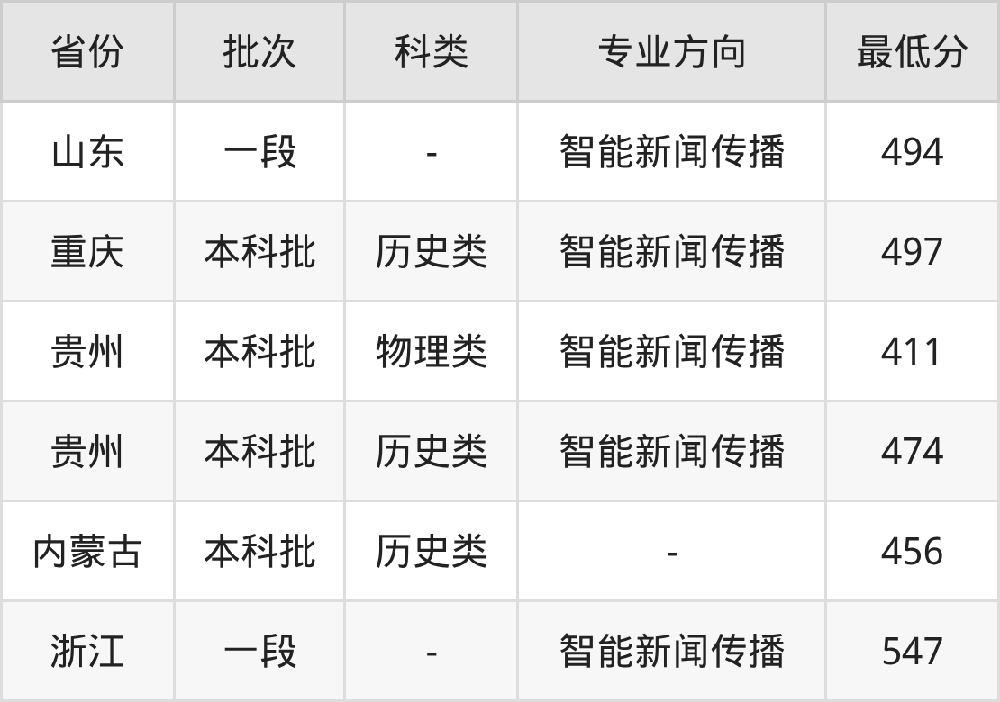 武汉工商学院新闻学专业录取分数线2025各省汇总显示,省外招生最低分为贵州411分、内蒙古456分、浙江547分、山东494分等。更多专业分数详情、选科要求、专业简介等均可在正文查阅。