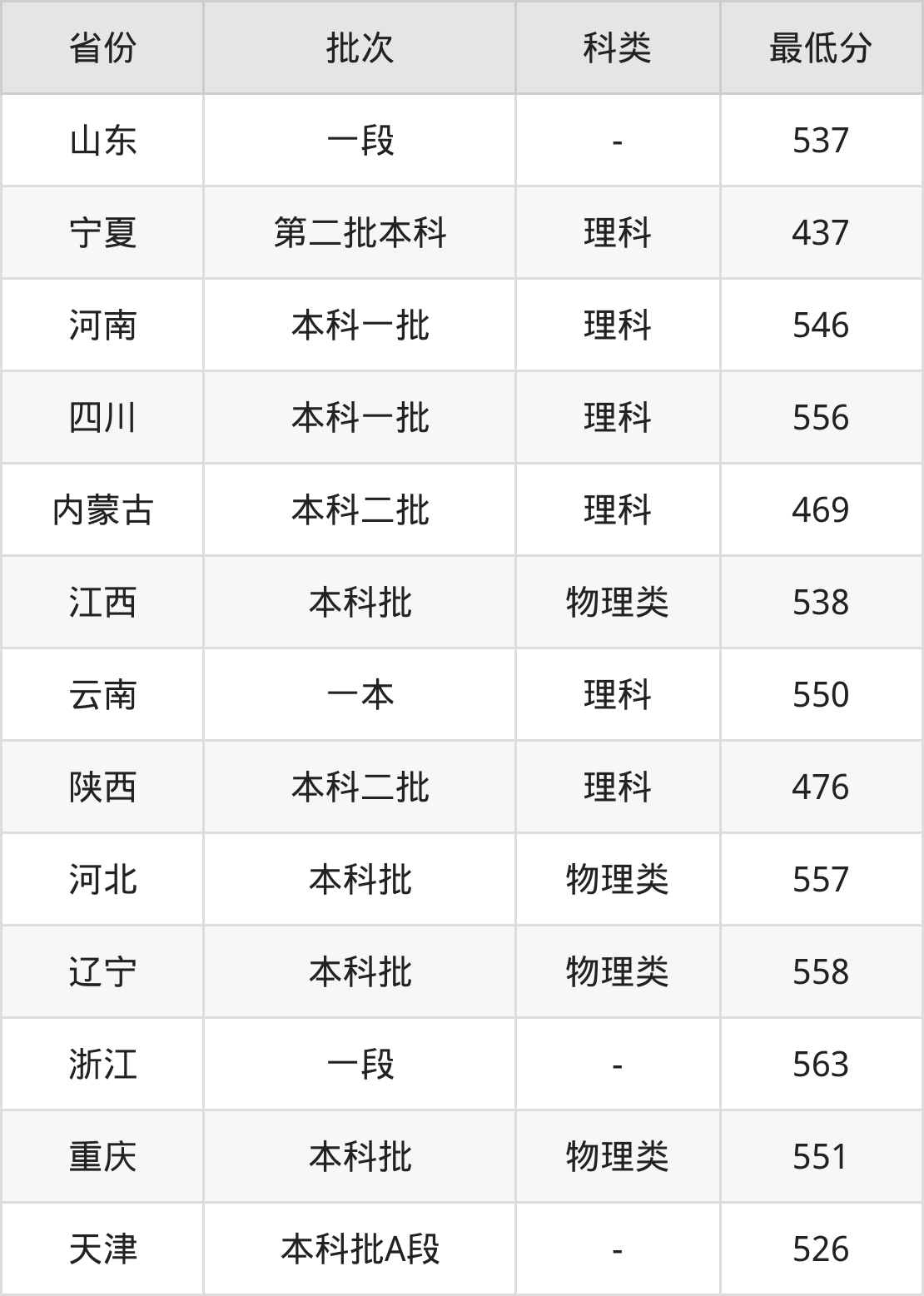 | 批次 | 科类 | 最低分 | 位次 |