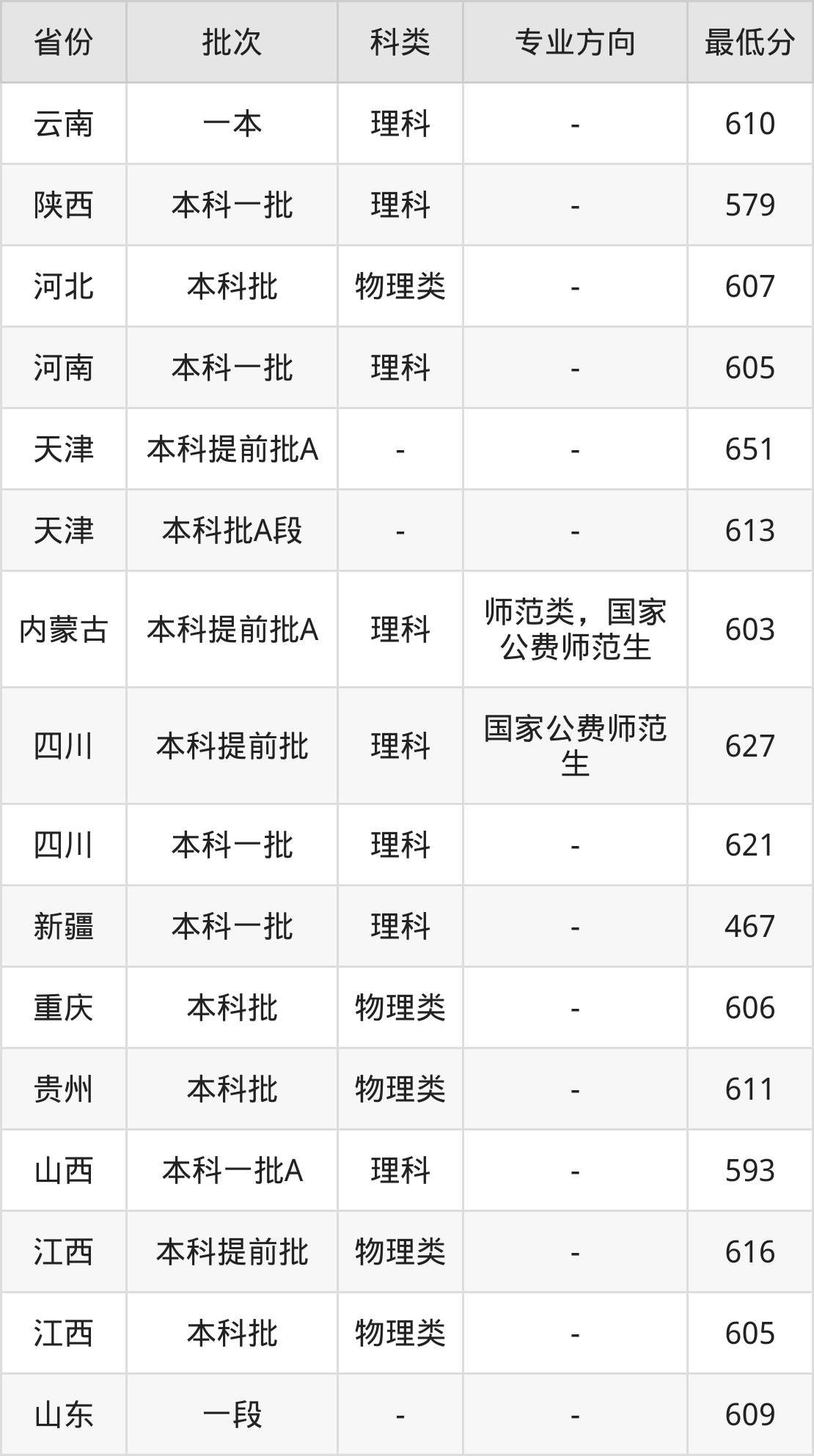 2024年西南大学物理学专业在重庆市内本科招物理类考生,最低分为606分(物),超本科线179分,考生最低录取位次为11309名。下面是专业分数详情:
