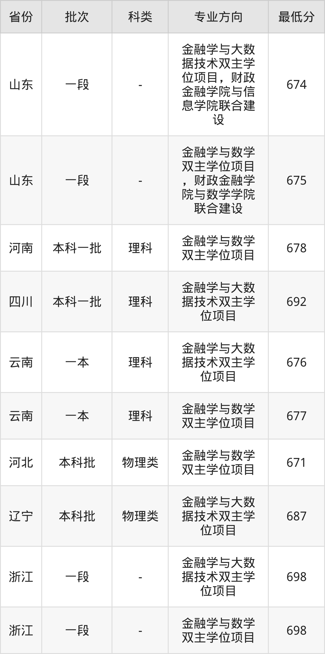 674分(金融学与大数据技术双主学位项目,财政金融学院与信息学院联合建设、位次640名),675分(金融学与数学双主学位项目,财政金融学院与数学学院联合建设、位次576名);