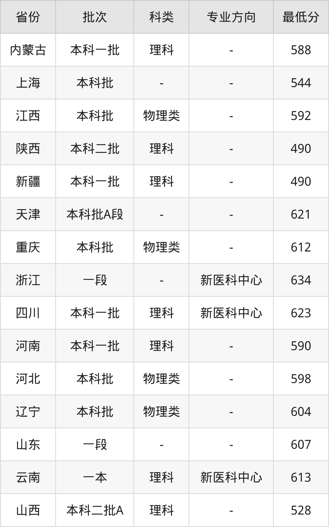 安徽医科大学临床医学专业录取分数线2024各省汇总显示,省外招生最低分为云南613分、内蒙古588分、重庆612分、上海544分等。更多专业分数详情、选科要求、专业简介等均可在正文查阅。