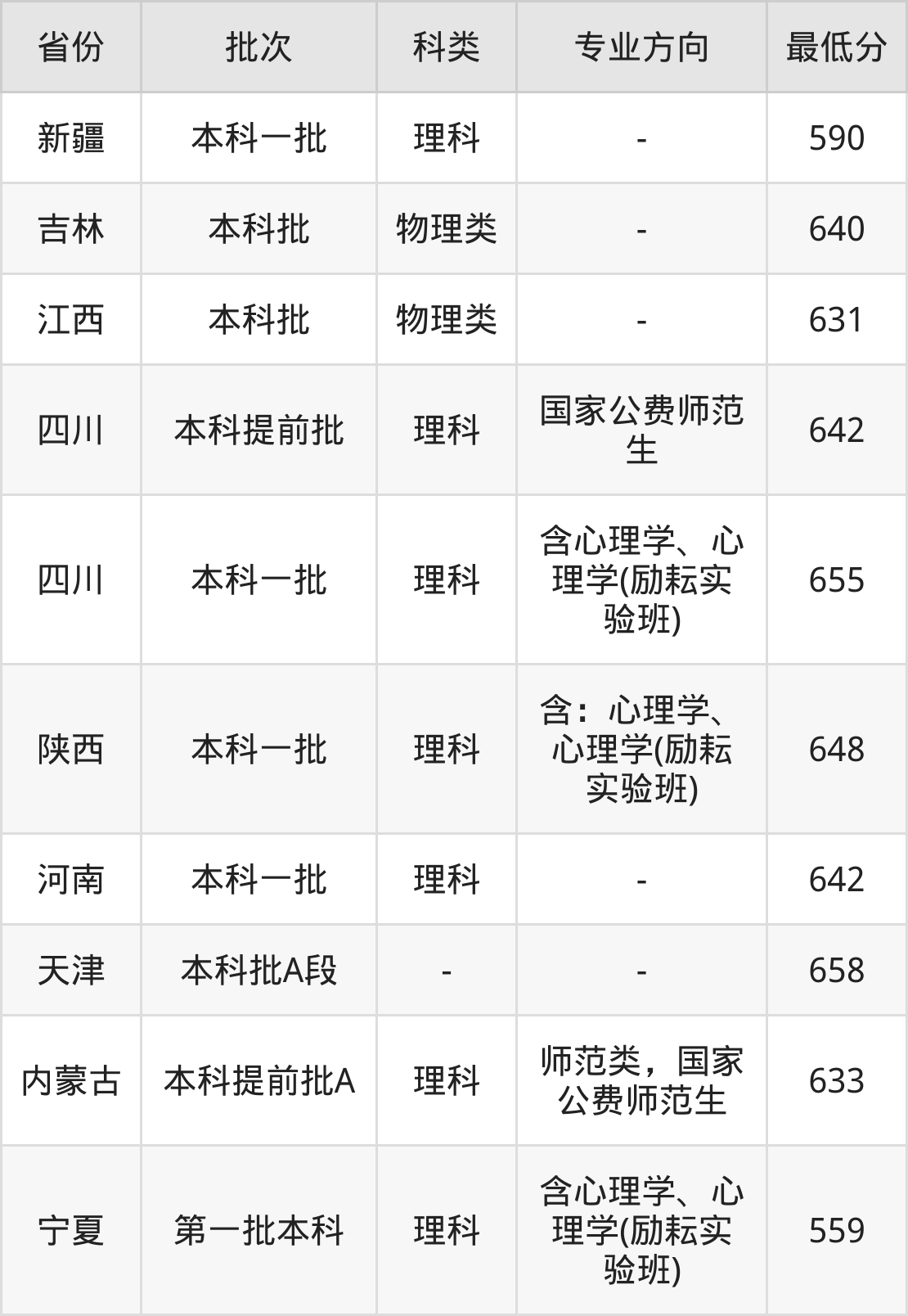 北京师范大学心理学专业录取分数线2024各省汇总显示,市外招生最低分为河南642分、宁夏559分、新疆590分、天津658分等。更多专业分数详情、选科要求、专业简介等均可在正文查阅。
