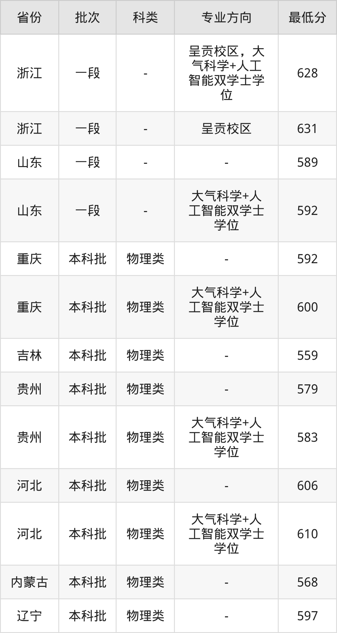 589分(位次33488名),592分(大气科学+人工智能双学士学位、位次30437名);