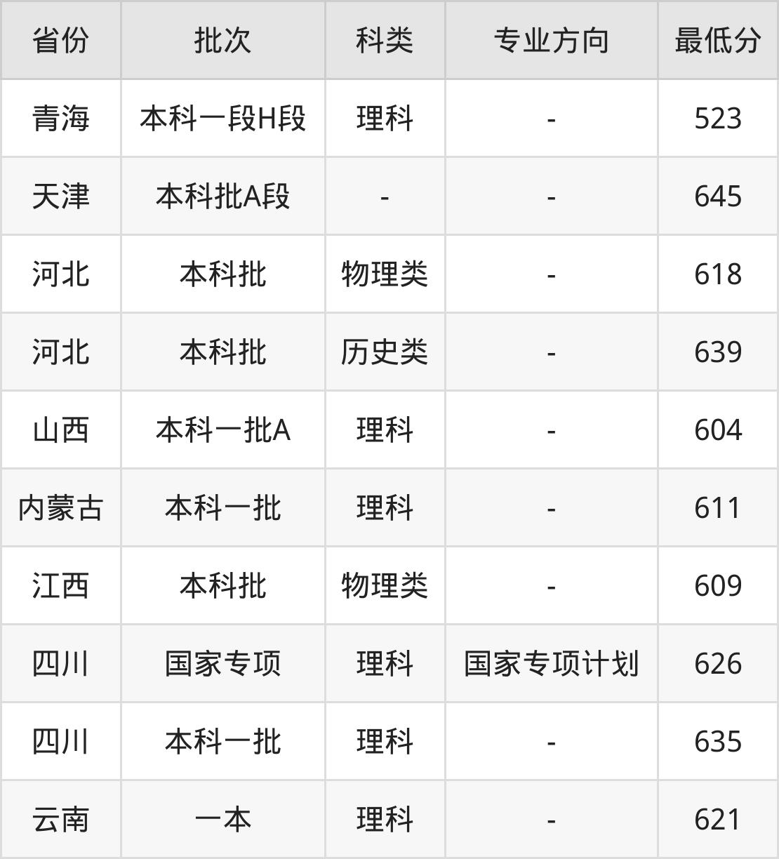 理科626分(国家专项计划、位次12394名),理科635分(位次8970名);