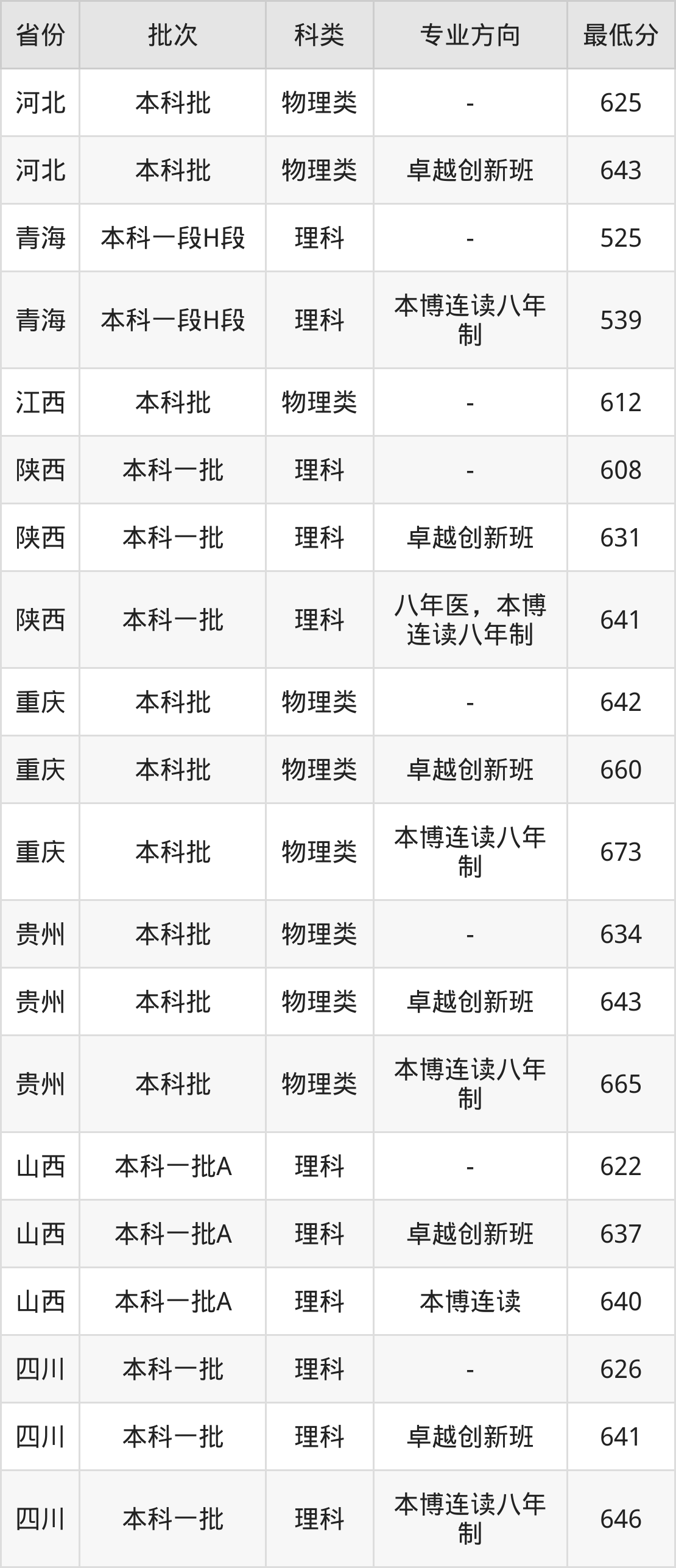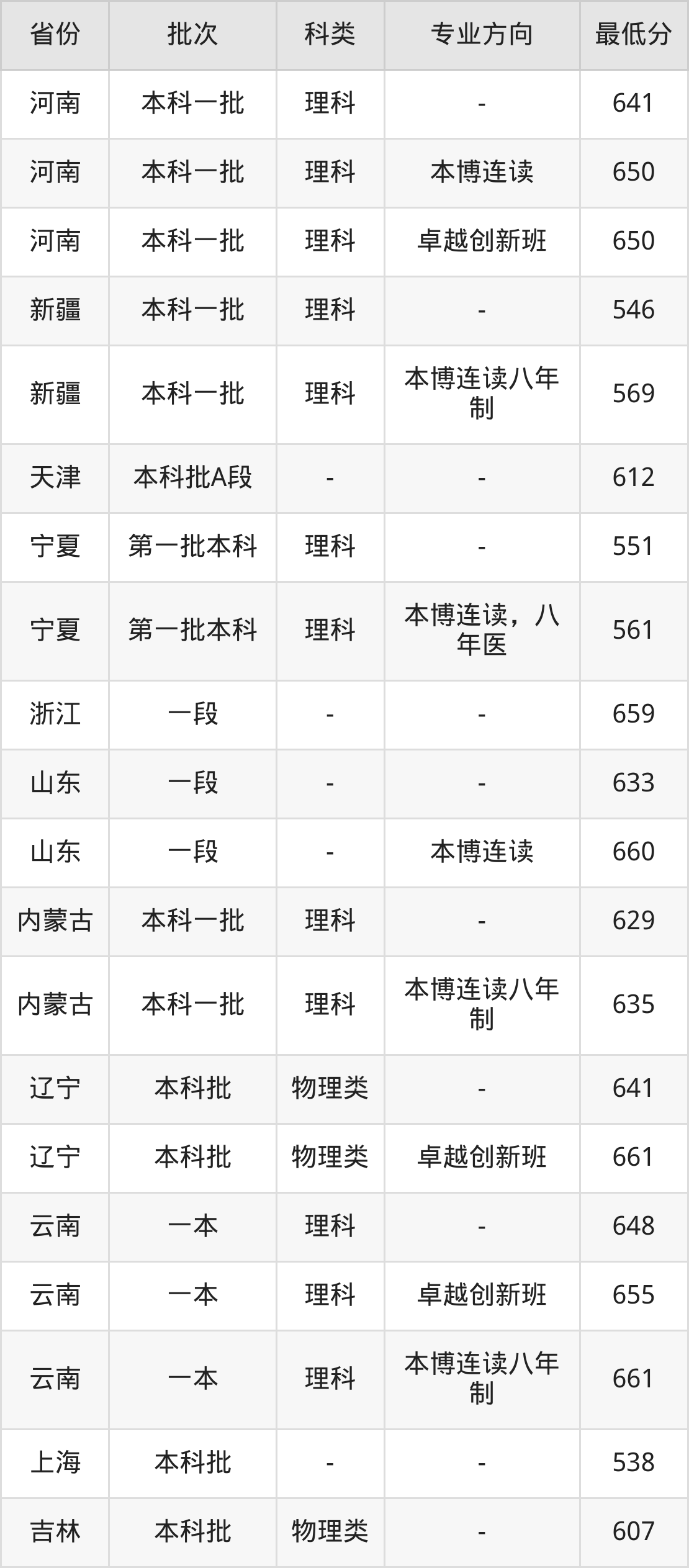 理科648分(位次1082名),理科655分(卓越创新班、位次722名),理科661分(本博连读八年制、位次513名);