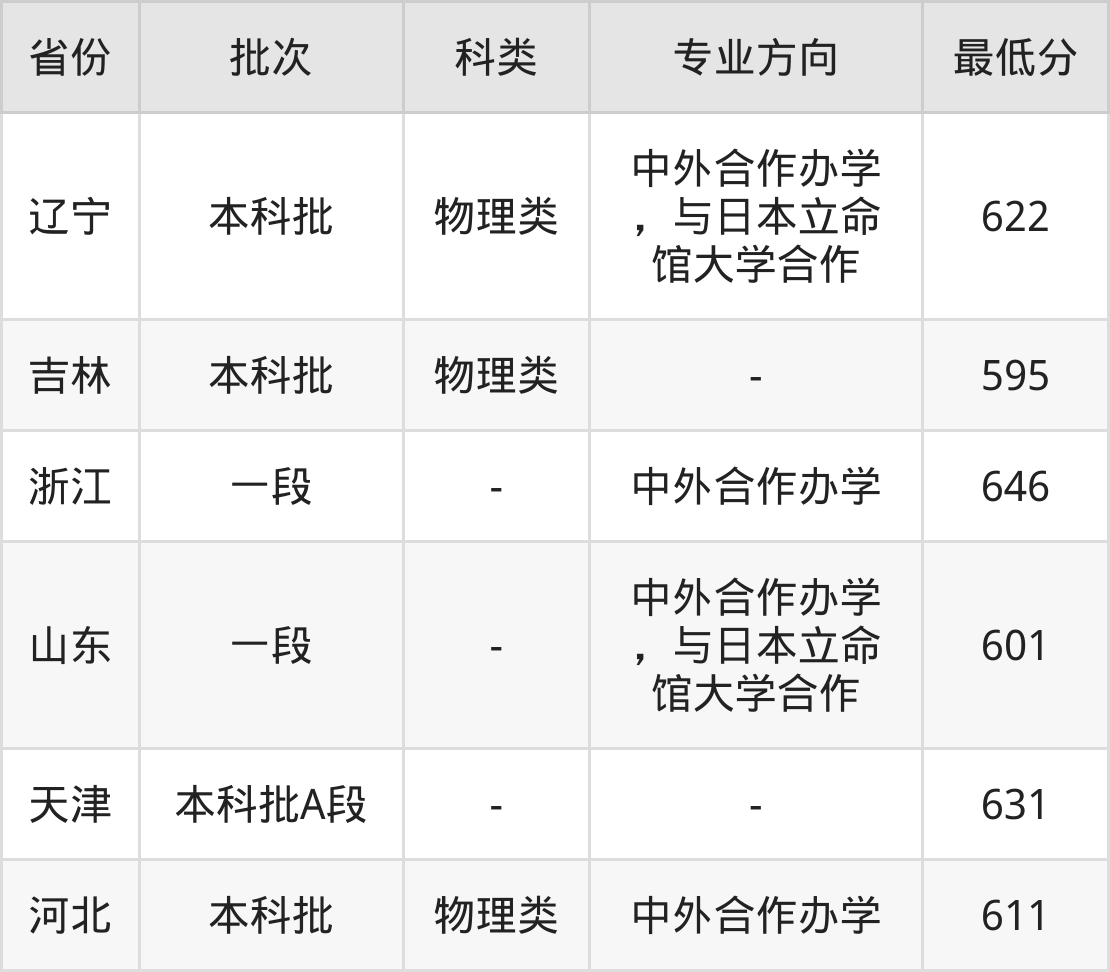 | 本科批 | 物理类 | 中外合作办学 ,与日本立命 馆大学合作 | 622 | 8928 |