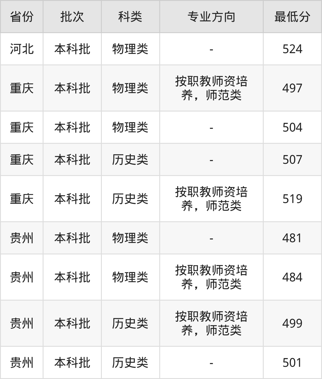 物理类497分(按职教师资培养,师范类、位次63946名),物理类504分(位次59528名),历史类507分(位次16063名),历史类519分(按职教师资培养,师范类、位次13219名);