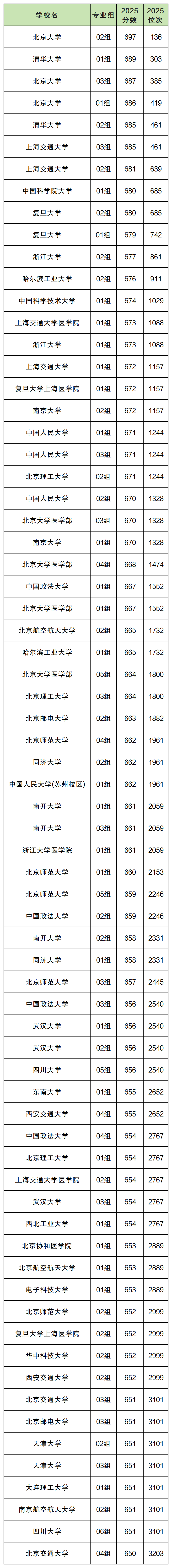 2025年北京高考录取投档线已经公布!在北京本科批招生录取中,清华大学最低分是685分、北京大学最低分是686分,考生需要超出本科线256分才能被录取。压本科线上的学校包括郑州财经学院03组、北京农学院06组、北京城市学院06组等。