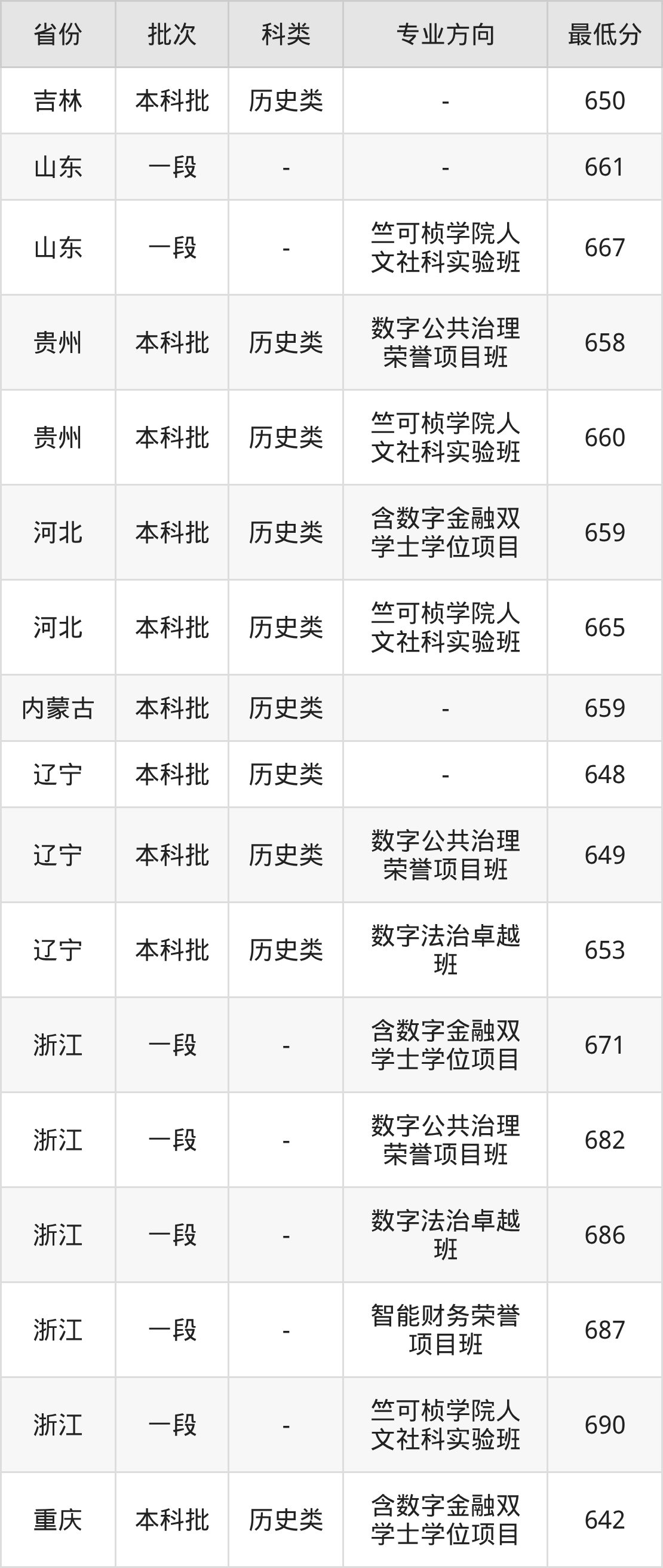 历史类659分(含数字金融双学士学位项目、位次181名),历史类665分(竺可桢学院人文社科实验班、位次96名);