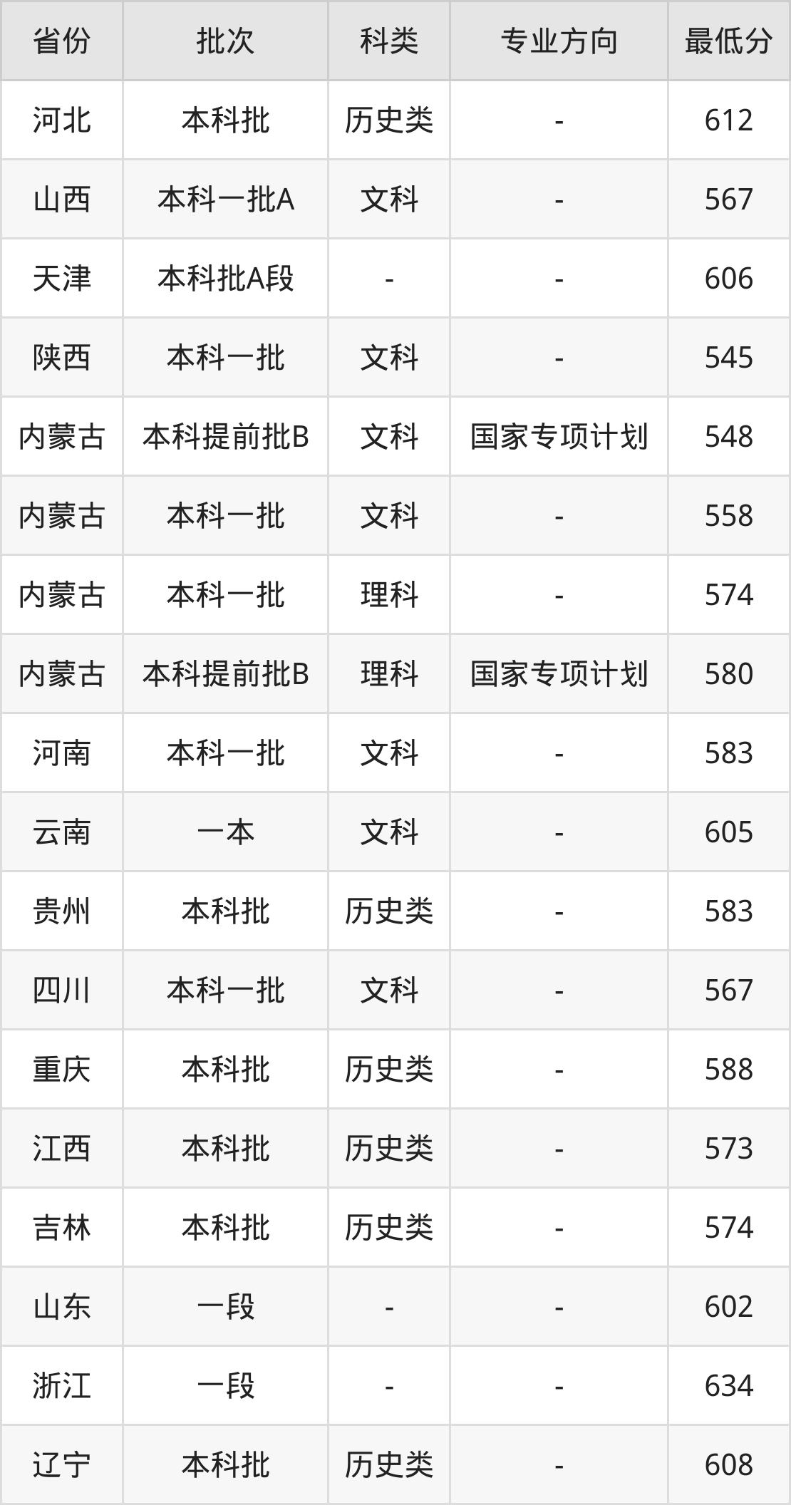 | 批次 | 科类 | 专业方向 | 最低分 | 位次 |