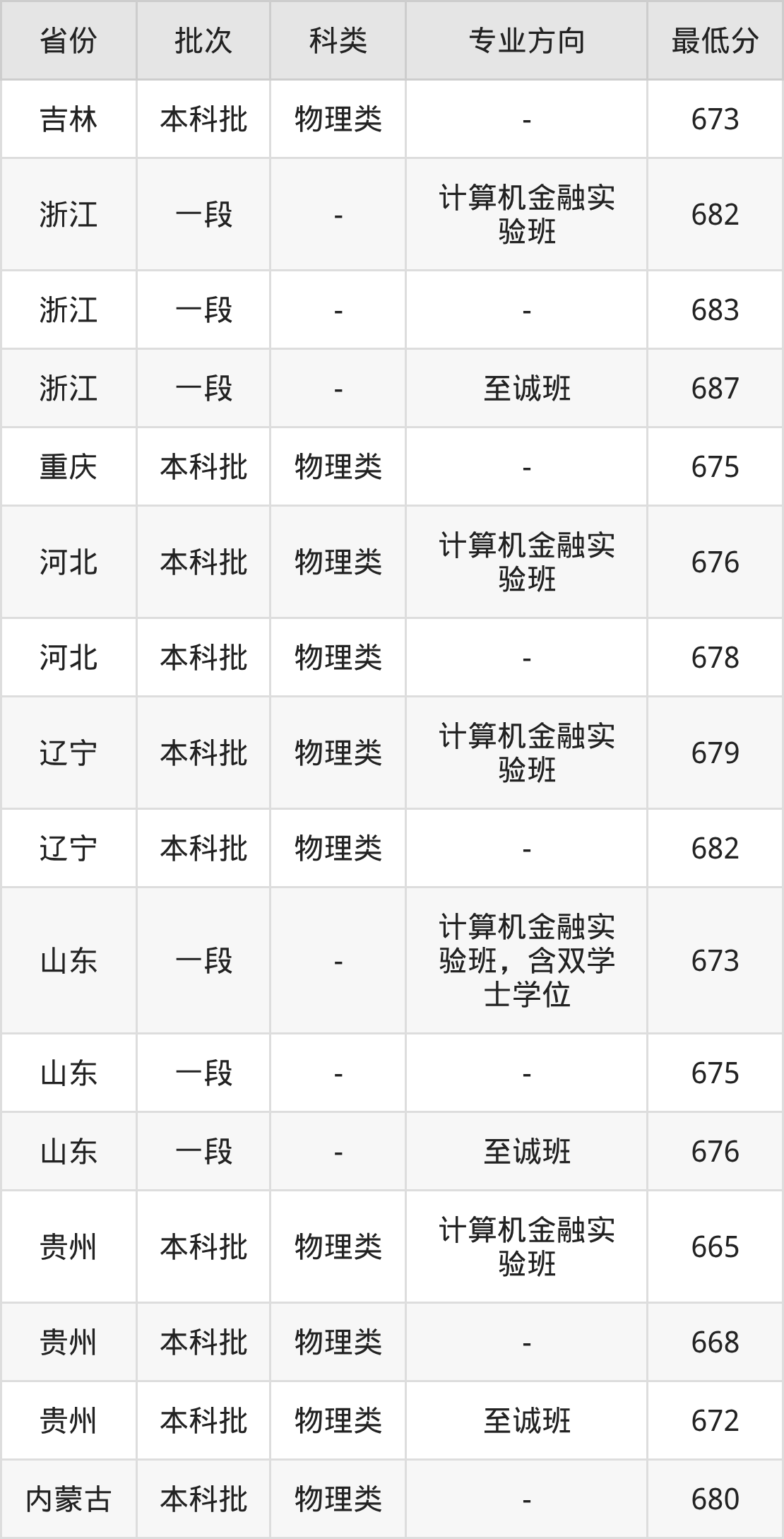673分(计算机金融实验班,含双学士学位、位次615名),675分(位次506名),676分(至诚班、位次450名);