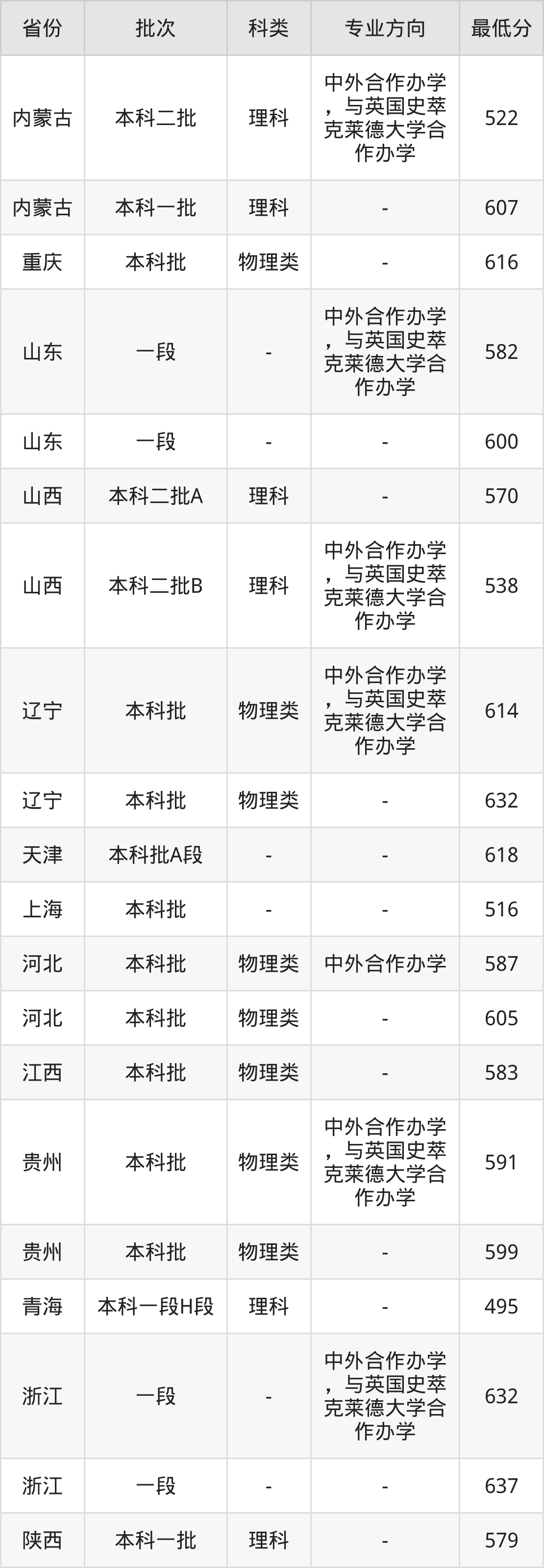 理科570分(位次16053名),理科538分(中外合作办学,与英国史萃克莱德大学合作办学、位次28447名);
