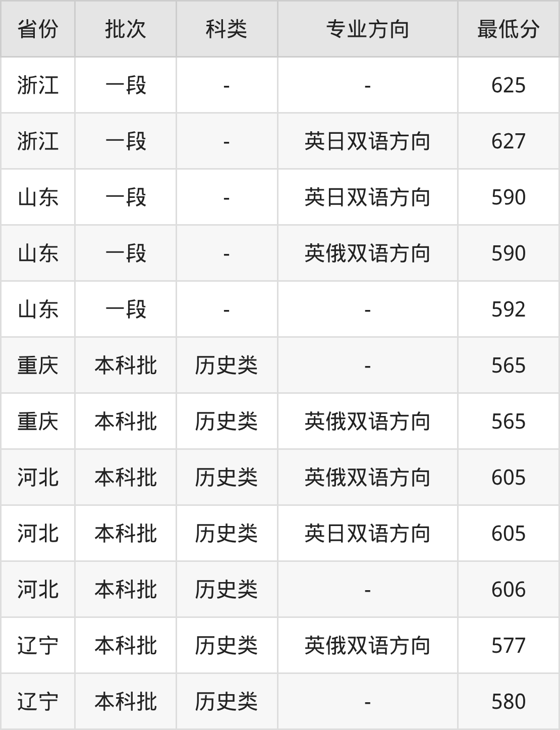 历史类605分(英俄双语方向、位次4942名),历史类605分(英日双语方向、位次4942名),历史类606分(位次4745名);