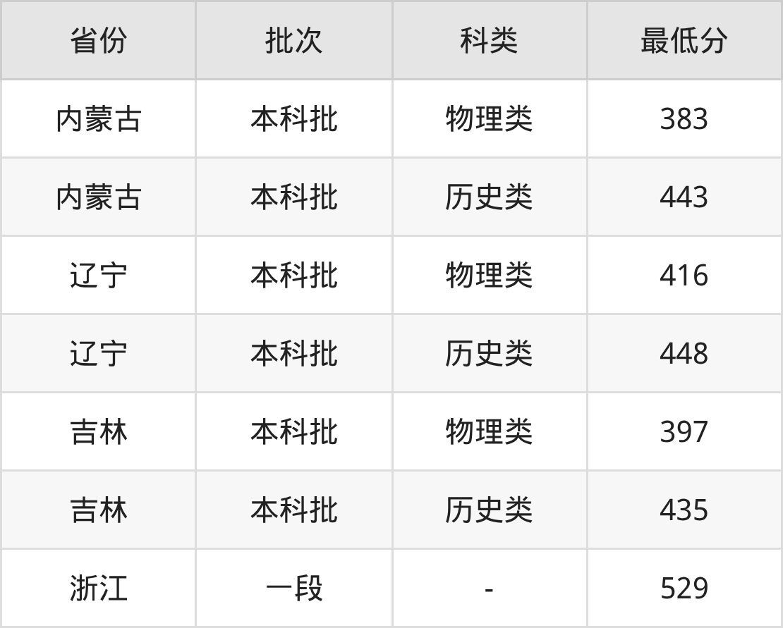 黑龙江财经学院国际经济与贸易专业录取分数线2025各省汇总显示,省外招生最低分为内蒙古383分、辽宁416分、吉林397分、浙江529分。更多专业分数详情、选科要求、专业简介等均可在正文查阅。