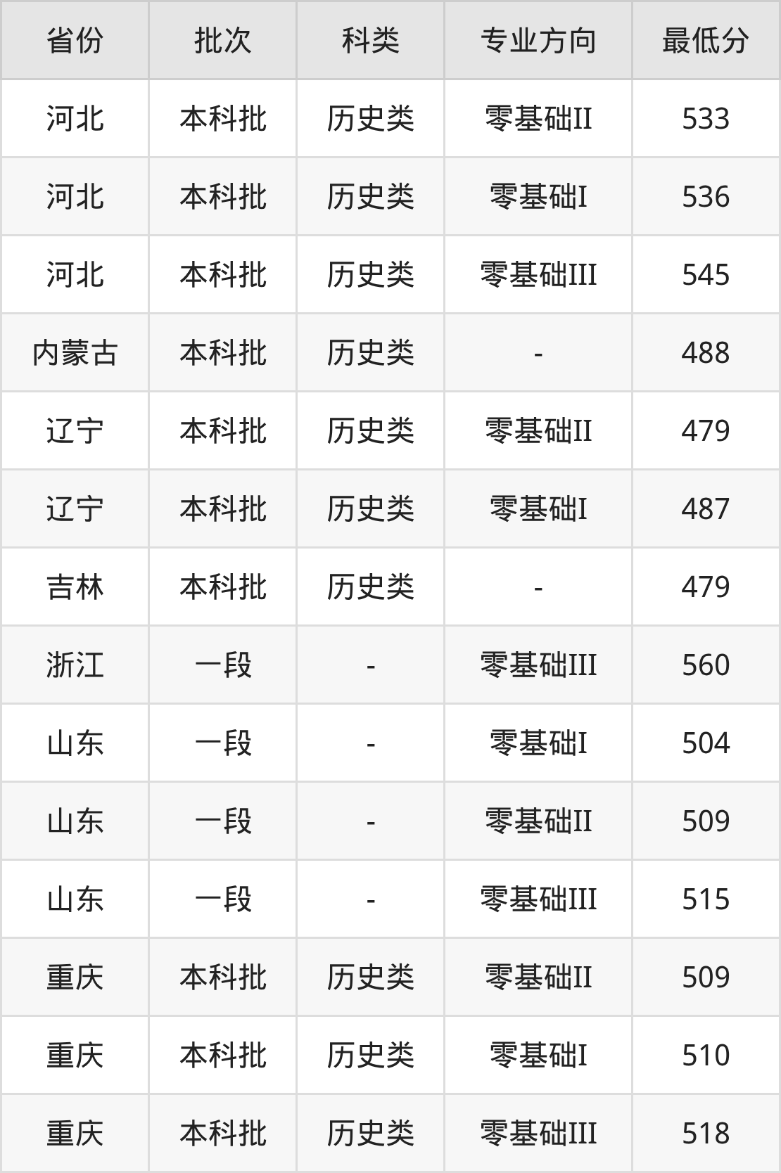 历史类533分(零基础II、位次30800名),历史类536分(零基础I、位次29242名),历史类545分(零基础III、位次24943名);