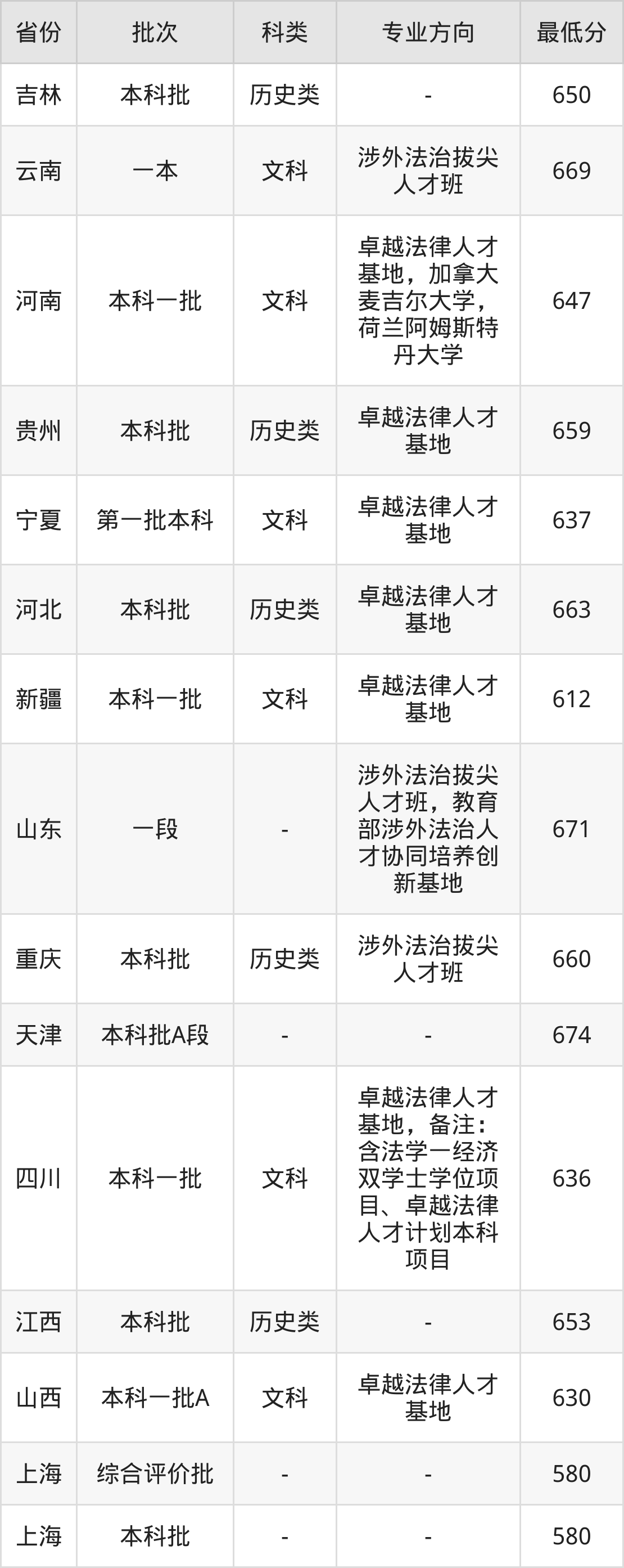 文科636分(卓越法律人才基地,备注:含法学一经济双学士学位项目、卓越法律人才计划本科项目、位次49名);