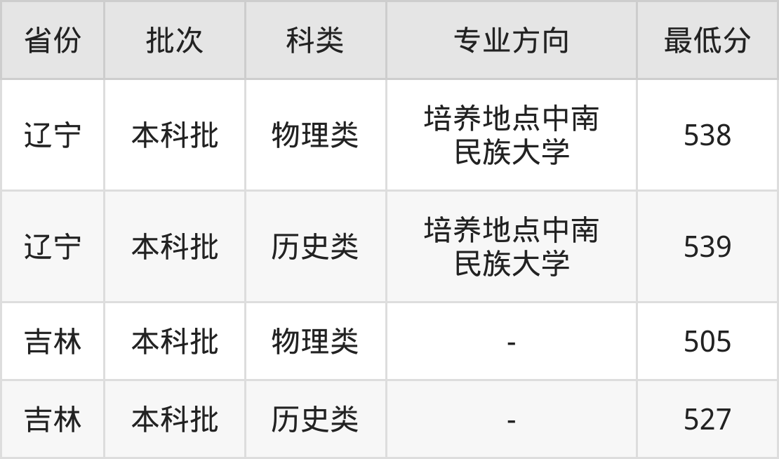 物理类538分(培养地点中南民族大学、位次36372名),历史类539分(培养地点中南民族大学、位次7268名);