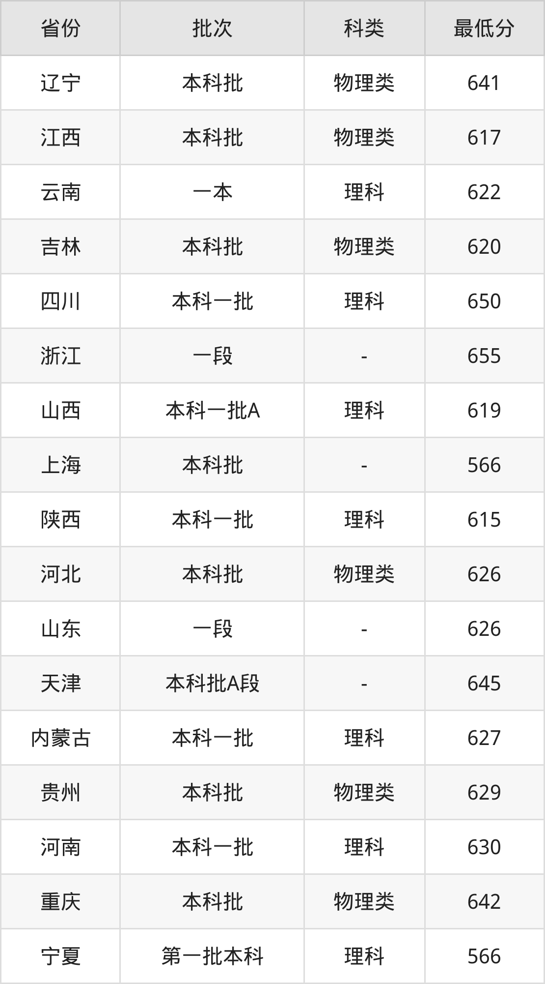 | 批次 | 科类 | 最低分 | 位次 |