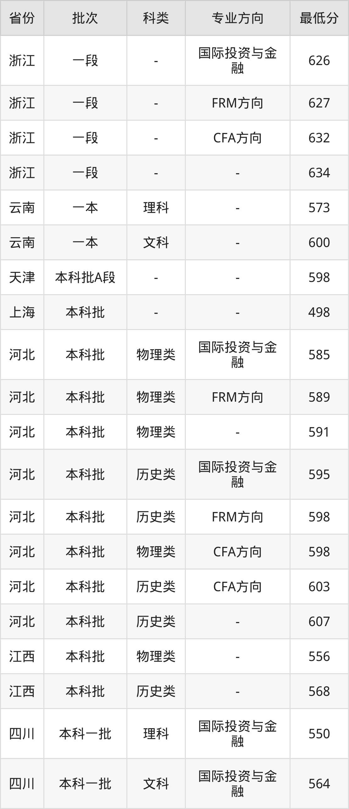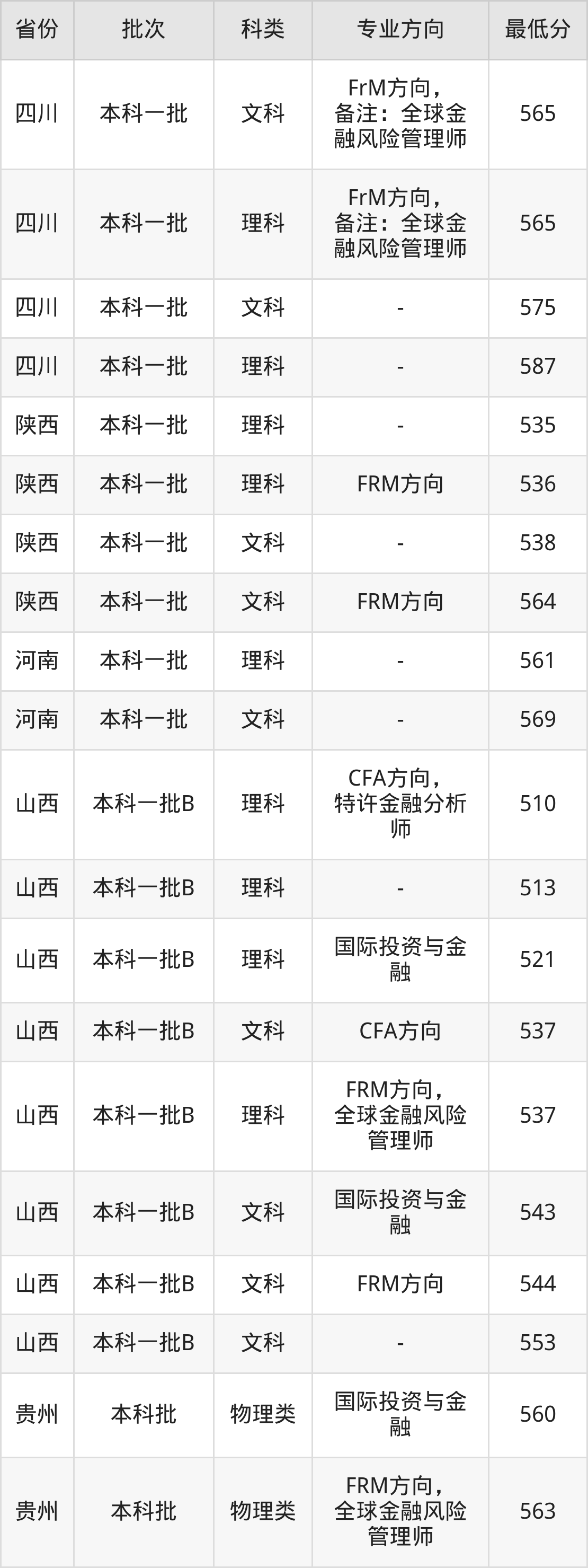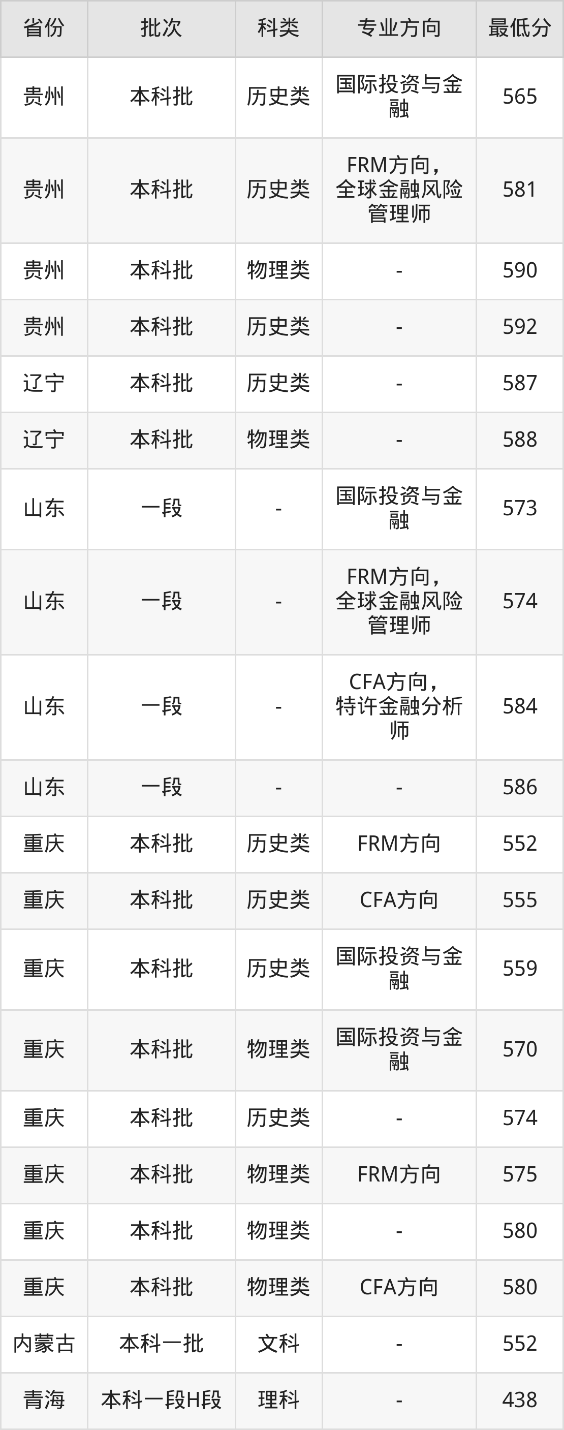 历史类552分(FRM方向、位次5824名),历史类555分(CFA方向、位次5449名),历史类559分(国际投资与金融、位次4953名),物理类570分(国际投资与金融、位次24357名),历史类574分(位次3385名),物理类575分(FRM方向、位次22254名),物理类580分(位次20262名),物理类580分(CFA方向、位次20262名);