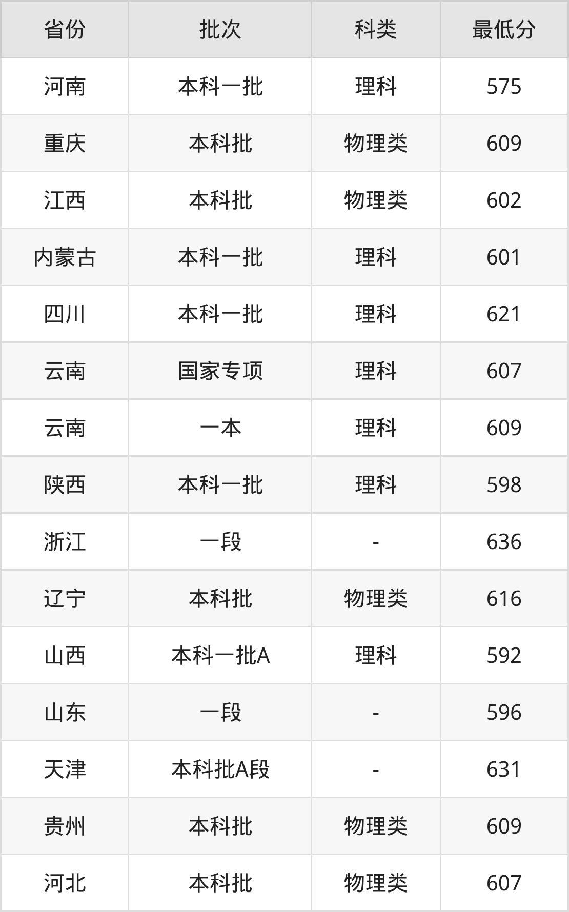 | 批次 | 科类 | 最低分 | 位次 |