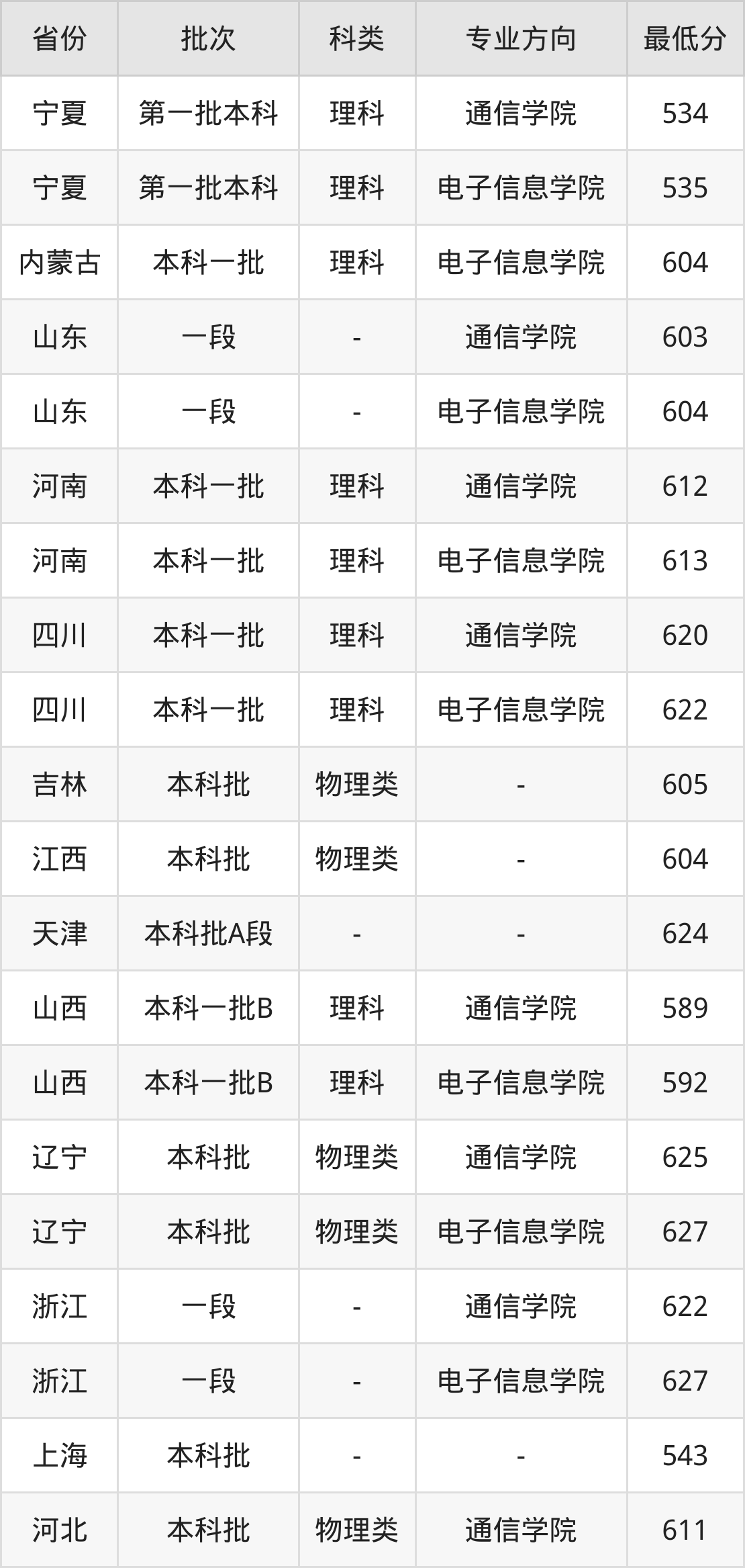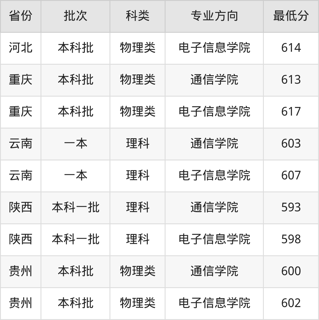 理科603分(通信学院、位次6962名),理科607分(电子信息学院、位次6119名);