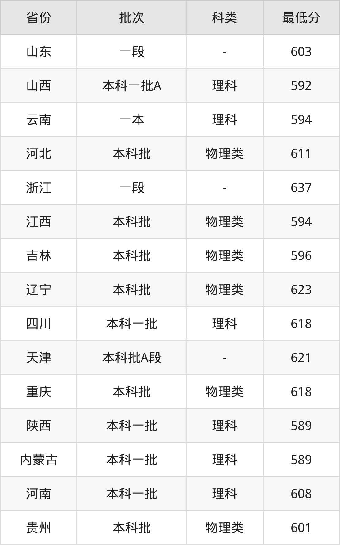 | 批次 | 科类 | 最低分 | 位次 |