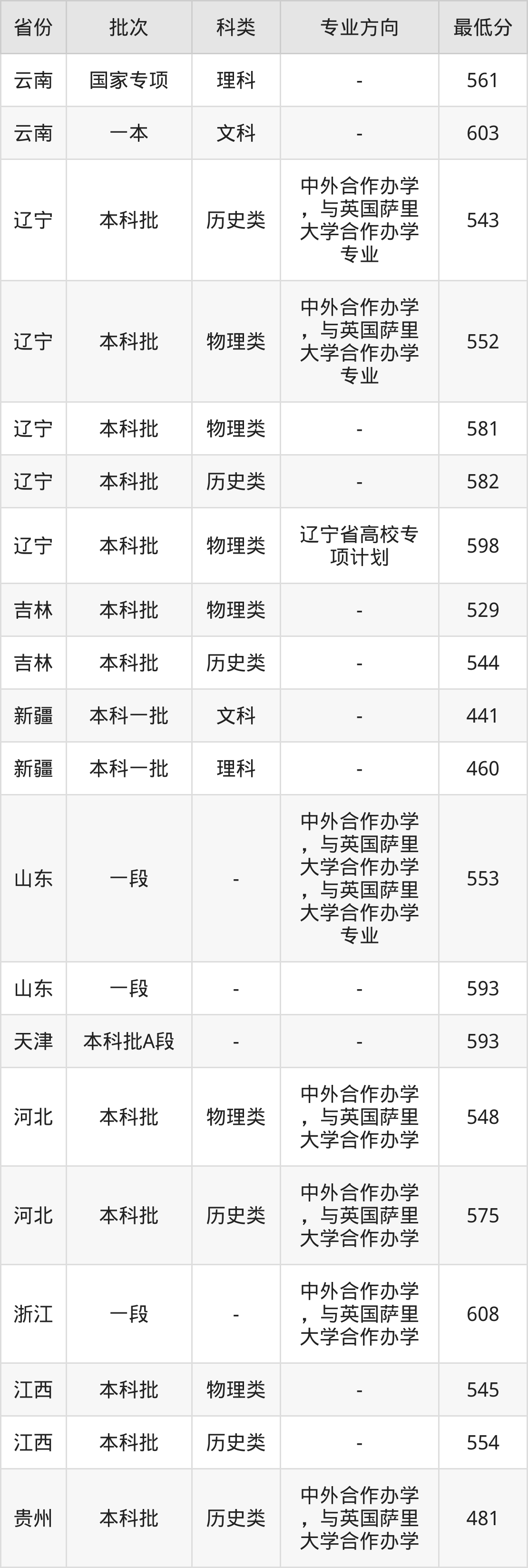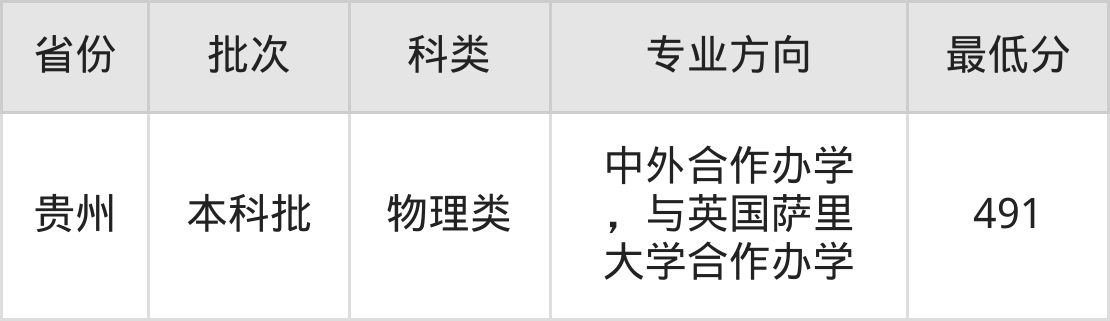 物理类548分(中外合作办学,与英国萨里大学合作办学、位次58236名),历史类575分(中外合作办学,与英国萨里大学合作办学、位次9066名);